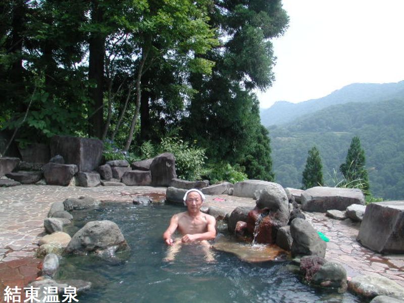 結東温泉は、国道117号線から約13km中津川に沿って山間の道を上った所にあります。1997年リニューアルオープンしたばかりで綺麗な施設です。広い敷地内には、木が植えられ、芝が敷き詰められて心安らぎます。本館「栃の実館」から、山沿いに2~3分程小径を歩くと、山彦の湯があります。そこには野趣あふれる露天風呂が待っています。この露天は高台にあり、露天風呂から眺める秋山郷の自然は素晴らしく、ダイナミックな山と空の眺望を満喫することが出来ます。
