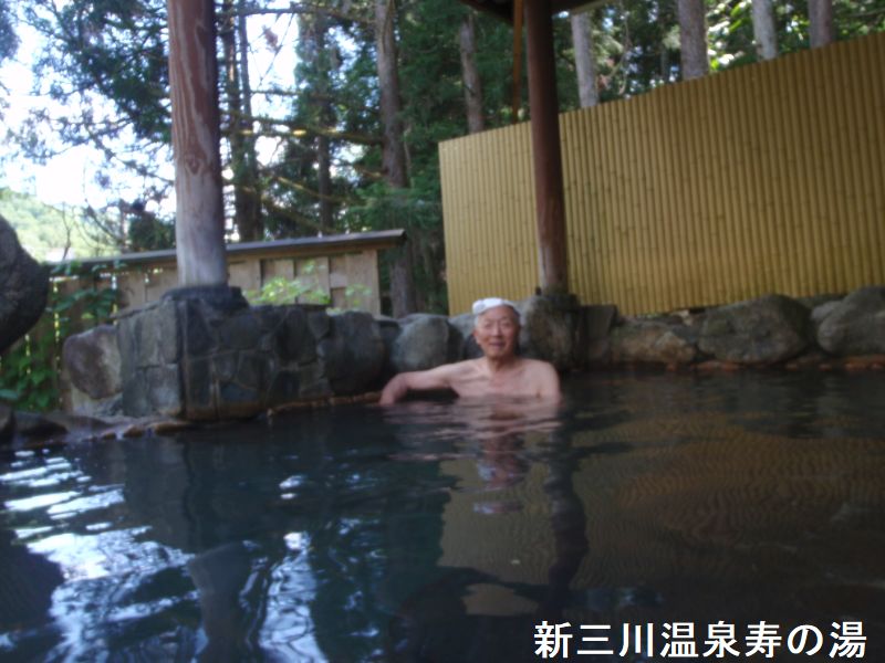 新と名乗るからには、新ではない普通の三川温泉もあります。その手前にある新三川温泉に「壱の湯」があり、多くのお客さんでにぎわっています。お風呂は内湯のみですが、お風呂にしては大きく、十分に寛げます。入って正面の窓側に浴槽が据えられ、右側に洗い場が配置されています。浴槽は大きなひとつの槽を板で二つに仕切っており、湯口側は熱く、湯尻側が適温になっていました。その仕切り板は底が刳りぬかれており、湯面側にも細長い穴が刳りぬかれていて、仕切り板の上下でお湯が貫通できるようになっています。温泉に含まれる金気の影響で湯口は赤く染まっているのが印象的です。そんな湯口から投入されるお湯の量はかなり多く、上に噴き出す感じで浴槽へ供給されています。浴槽のお湯はうしお汁のような感じで少々の青白い笹濁りを呈しており、浴槽内は赤黒く光っていました。そんな浴槽に肩まで浸かってみますと、食塩泉的なツルスベ浴感と硫酸塩泉的な引っかかる浴感が拮抗して肌に伝わってきます。食塩の効果でしょうか、暫く汗が止まらなくなるほどよく温まります。鮮度感も良好です。