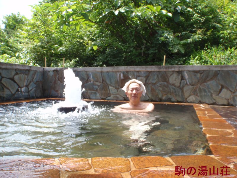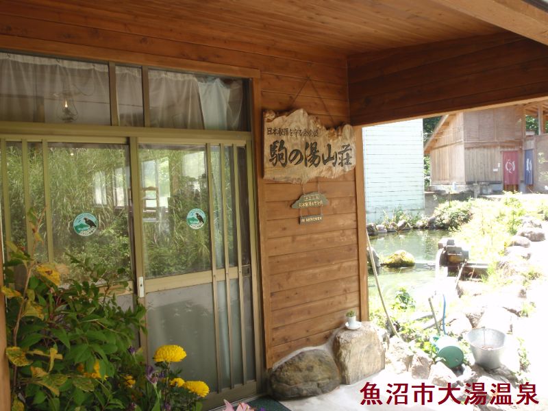 芋川、折立などの温泉地が点在する湯之谷温泉郷の奥に位置する秘湯の宿です。352号線から木々に囲まれた細い道を進んだ先に突如現れる「駒の湯山荘」は山小屋風の素朴な佇まいです。山中にありながら雑誌・自遊人に紹介され、しかも特典対象施設という事で、立寄り客でかなりの賑わいです。お宿は宿泊棟と休憩舎の二棟にわかれ、両方に浴室がありますが、立寄り可能なのは後者のみです。休憩舎は内湯のみで浴室は二つあり、混浴浴室と女性浴室を備えています。石板張りの混浴浴槽は8~9人サイズのもので、浴槽中央には円柱状の湯口があり、20cmほどの高さまで噴水のように湯が吹き上げています。凄い勢いの源泉が吹き上げており見るも楽しい光景です。この浴槽サイズで、度肝を抜く桁違いの源泉投入量はなかなかお目に掛かる事はありません。湯は無色透明、石膏臭に弱タマゴ臭があります。キシキシの浴感があり、湯中を細かい気泡がプカプカとたくさん浮遊してます。ぬる湯で長湯向きですが、次々訪れる入浴客のため、場所を譲ることになります。