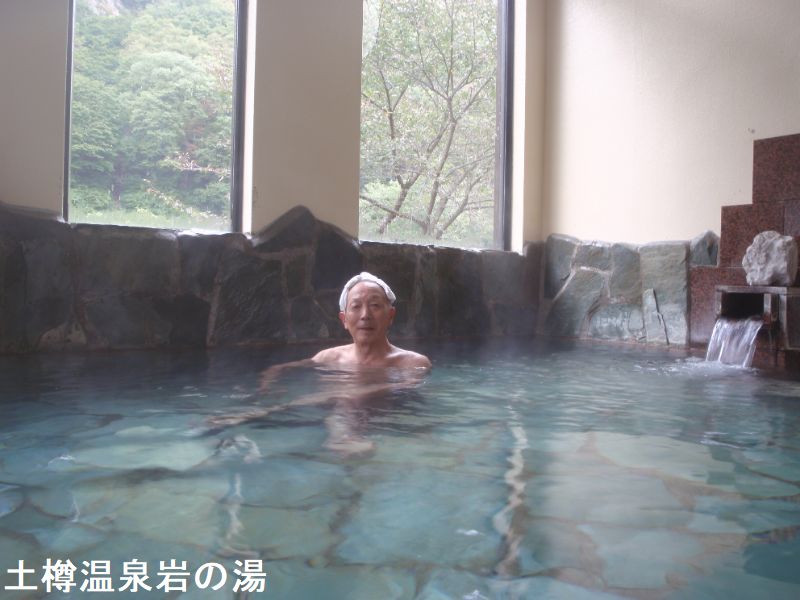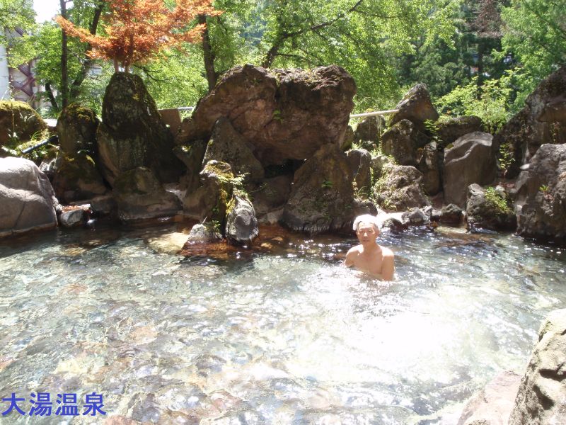 ゆとりある空間に佐梨川の清流の音が流れ緑もまぶしい山の向こうに、まだ残雪が輝くもうひとつの山がそびえたちます。開湯800年の歴史ある大湯温泉は、収容人数の多い大型ホテル旅館や規模の小さな旅館など、奥只見湖観光の拠点として賑わっている。ホテル湯元は、旧湯之谷村に位置し日本百名山の一つ越後駒ヶ岳の北隣にある老舗の大型ホテル、大湯温泉で最も大きい宿です。浴室はホテルの規模なりに大きいです。浴槽は30人サイズです。中央の柱に岩が寄せ集まっていて、下から突き出した管を通して無色透明のお湯が投入されています。少し熱めの適温といったところです。時おり白い小さい粒が漂っているのは湯の花だと思います。泡付きはなく、特徴的な匂いもない。裏を返せば消毒の塩素臭は感じません。奥の隅っこには内湯とほぼ一体化してつながった6名サイズの小浴槽もあります。こちらは湯口から遠い分少しもぬるいので、ここを陣取るのがいいかもしれません。露天風呂は、。5~6名サイズの岩風呂で屋根付きで、周囲は庭園風に整えられており、目隠しの塀越しに越後駒ヶ岳の肩口にあたる一部がどうにか見えます。