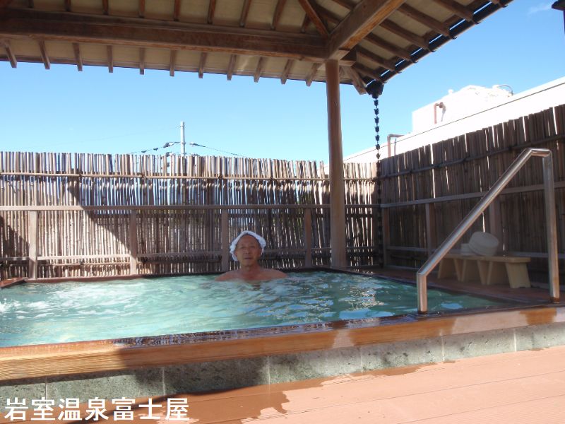 岩室温泉富士屋は、「岩室富士」と呼ばれる松岳山の麓に佇む施設です。木々が、花が、風が囁く声に耳をかたむけると、そこに癒しがあります。自然と機能性、歴史と斬新!豊かな地だからこそ可能な異質なものたちの調和が、深いリラクゼーションを運んでくれる「癒やし」の空間です。浴室は最上階にあります。富士屋の湯は、岩室温泉唯一の自家源泉で、「上の郷温泉」と命名されています。場所は、姉妹館の「ゆめや」の敷地内で掘削されたそうです。湯は地下1300mからくみ上げています。内湯は、広々としていて、色は、白みがかったグリーン色をしています。ほんのり硫黄の香りがしました、しっとりとした湯で、とても入り心地がよいです。それほど硫黄が強い感じはせず、柔らかい感じのする湯でした。左手側には、丸太で少し区切られていて、温度の違うゾーンがありました。硫黄泉は、温度が違うと色が変わるのが面白いです。露天風呂は屋根付で、緑色ながら少し透明度が増しているのは、温度を高めに設定しているからでしょうか。浴槽および周りは檜作りで、浴槽床は十和田石との事です。露天風呂からは岩室富士と称される松岳山(松ヶ岳)を臨むことができます。