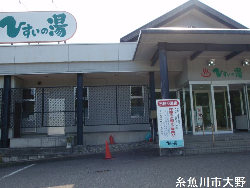 フォッサマグナ糸魚川温泉 ひすいの湯は新潟県糸魚川市にある日帰り温泉です。名前が独特ですが、糸魚川の下を走る断層フォッサマグナと名物の翡翠から名付けられています。源泉は糸魚川と静岡を縦断する巨大な断層線「フォッサマグナ」の地中から噴出する高温良質な温泉。地下1000メートルから約100℃の湯が毎分1500ℓも噴き上げます。なんといってもこの温泉の特徴は油の臭いがする温泉だということです。これを聞くとちょっと二の足を踏むみますが、実際に風呂場に入るとさほど気になりません。温めの寝湯が気持ちよく、露天風呂になると油臭は全く気になりませんでした。