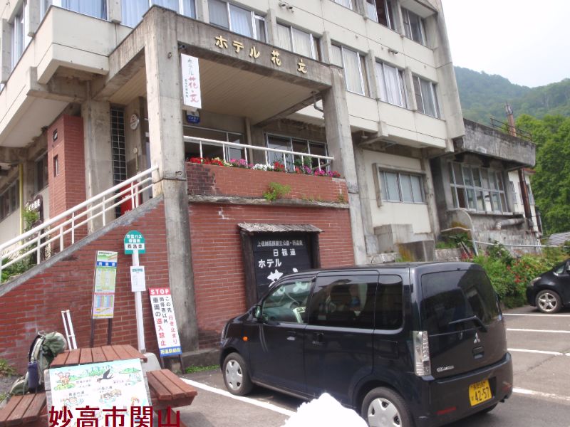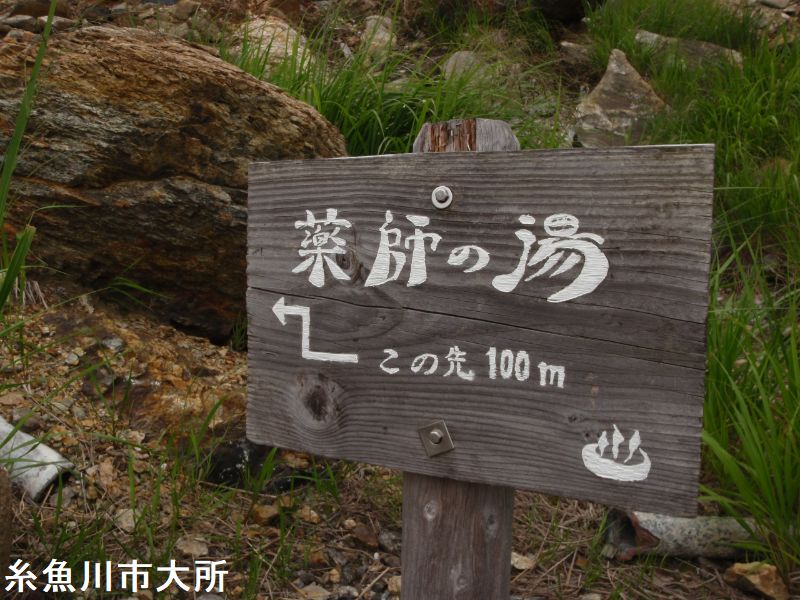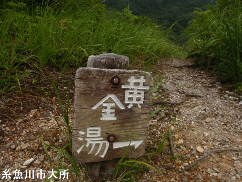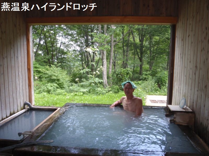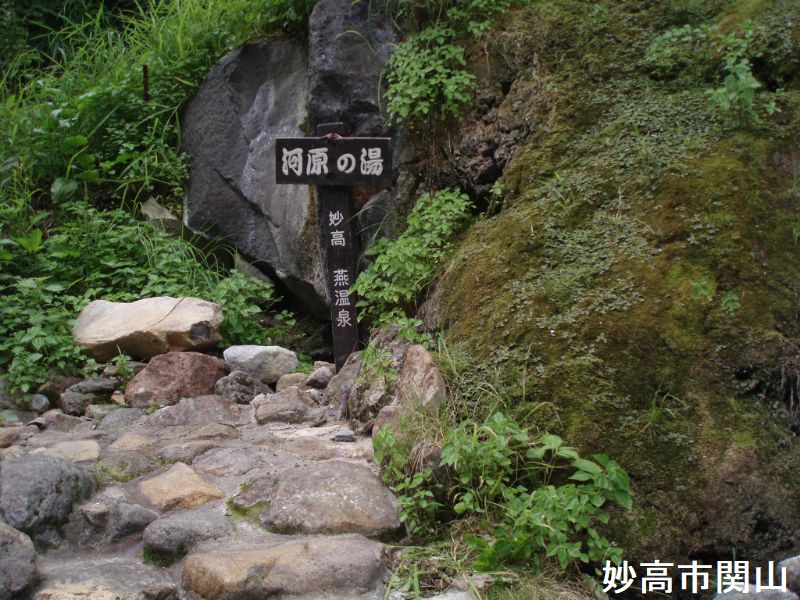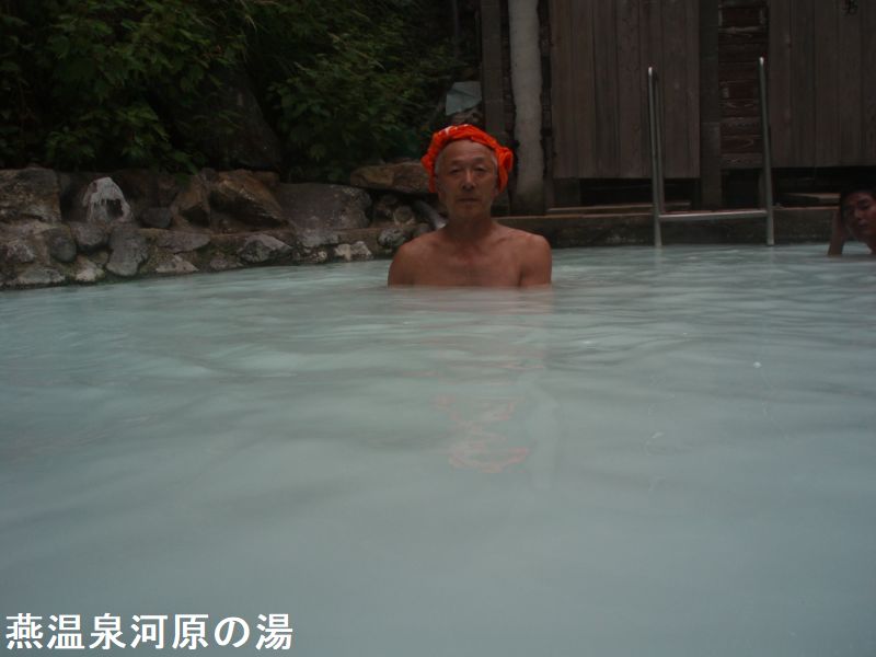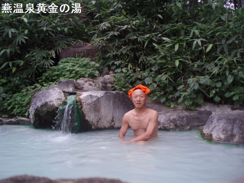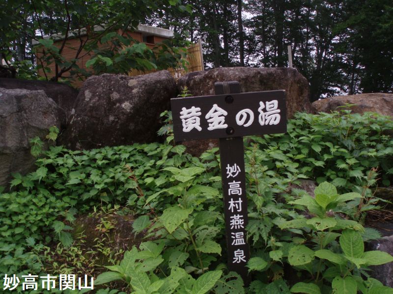 燕温泉は、明治時代の開湯で妙高山周辺では一番高所に位置しています。明治時代の開湯で、妙高登山の基地になっています。温泉名の由来は岩ツバメが多い土地であった事からだそうです。黄金の湯は、温泉街から温泉神社の脇を通り登山道を少し登った所にあります。スキー場のスロープの途中にある。大きな岩で囲った露天風呂で男女別に湯船があり、それぞれに脱衣小屋があります。パイプからお湯が勢いよく注がれていました。お湯は白濁していてちょっとぬるめで硫黄のにおいがします。この露天風呂は全国的に有名で人気があります。