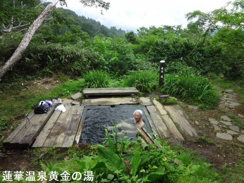 春先でも雪はまだ数メートル単位で残っているので、5月いっぱいは雪景色の入浴が楽しめます。野天風呂があるのはロッジの裏手で、登山道を登って行くと、4つの野天風呂に入る事ができます。足元は斜面でぬかるんでいる事もあるので、歩き易い靴を履き、脱ぎ着し易い服装で行くのがお勧めです。「黄金湯」を目指して登山道へ入って10分ほど歩くと、案内板が見えてきます。この当たりでは登山客とすれ違う事もあるので、すれ違う際には「こんにちは」と挨拶するのが山のマナーです。パッと視界が開け、突如として黄金の湯が現れます。元々上杉謙信が鉱山を掘っていた時に、偶然見つけたという蓮華温泉は、鉱夫たちが疲れを癒すために使っていました。この湯をありがたがり、「黄金」と呼んだのではないかと言われています。1mほどの深さがあるので、肩のあたりまで浸かる事ができます。周囲に広がる美しい緑を眺めながら、森林浴と入浴を同時に楽しめるというなんとも贅沢な時間です。耳を澄ませば、ウグイスなど野鳥の声も聞こえてきます。