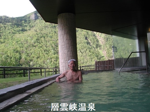 ユウヤンベツ川沿いには沢山の野湯があります。その中でぱっと見て、最も美しいのではないかと思うのがピラの湯です。テムジンの湯より少し上流に遡ると、アイヌ語で「絶壁」を意味する「ピラ」の湯があります。言葉通り断崖の岩の割れ目から熱い湯が落下しユウヤンベツ川へ注ぎ込んでいます。この崖下を掘った素朴な湯溜まりです。源泉は50度近くで周辺は熱すぎて入浴できず、源泉の少ない方の湯船へ行きましたが、しかしそっちも熱い!湯溜まりの底には泥がたまっているし、この野天風呂は私には、熱くて足湯が精一杯の挑戦でした。う~~む!!残念!!