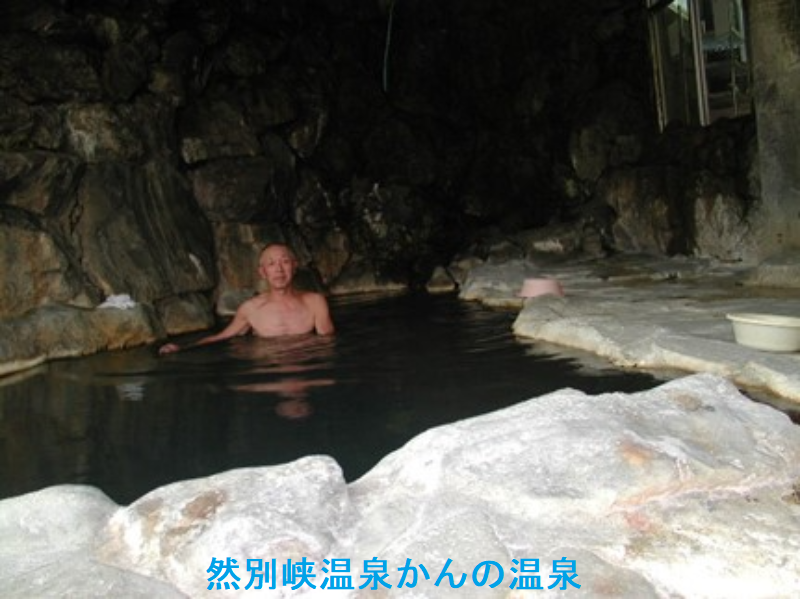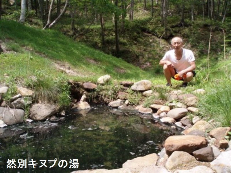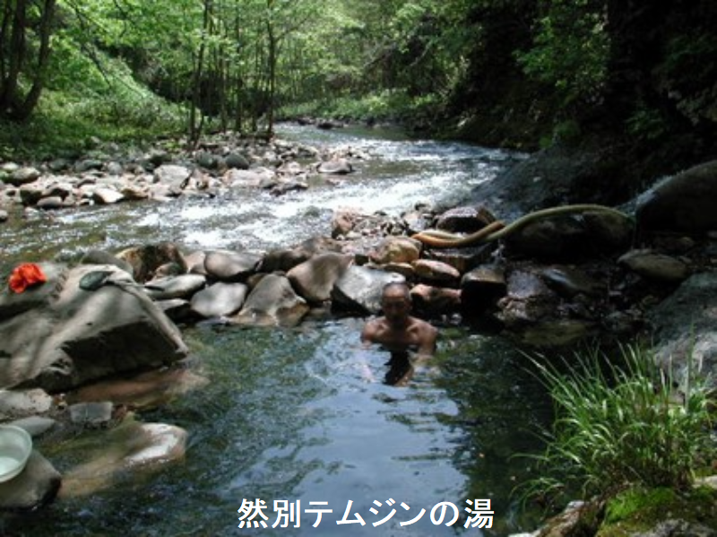 熊笹が生い茂る獣道のような道を進み、九の沢川とユトクルシュナイ川がユウヤンベツ川に合流する所に岩盤の底から湧く手掘りの野天風呂「テムジンの湯」があります。本土では味わえない大自然の中の自然湧出の温泉です。山側にある岩盤の割れ目から源泉が湧き出していたので近付くと少ないながら結構な熱さの湯が湧出しています。「テムジンの湯」の命名は温泉博士の松田忠徳氏によるもので、テムジンとは「チンギス・ハーン」の幼名なのです。ハーンの故郷モンゴルも温泉の宝庫なのです。