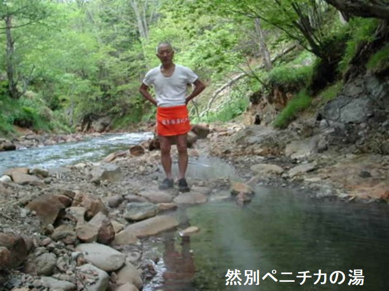 ユーヤンベツ川沿いには沢山の野湯がある。その中で一番有名なのはここペニチカの湯とメノコの湯。こちらは管理してくださっている地元の方がいて、適度に綺麗にされている。露天風呂は15人ほど入れそうなほど大きい。源泉温度が高めの為、ホースで川の水を入れていた。濃度はユーヤンベツ川沿いの中では一番低く、サラッとした肌触りで匂いも薄い。ゆったりのんびり浸かるのに適した露天風呂だと思います。ここの湯溜まりは、雨が降って川が増水すると、たちまち水没してしまいます。川底から50℃を越す熱い湯が湧き出ていますので、熱くて入れません。