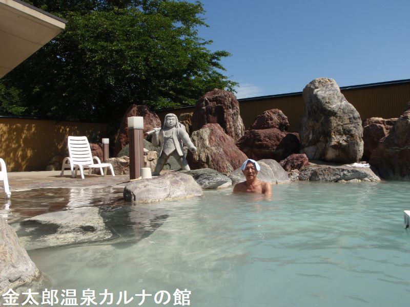 日帰り温泉「カルナの館」のパノラマ大浴殿は、昭和40年に「天つ神の座す」という謂われのある魚津・天神山のふもとに開湯いたしました。カルナの名は古代ローマ神話の“健康を守る女神”に由来しております。屋内としては、国内最大級で浴槽を富山湾に、岩を立山連峰に見立て、全国から集められた銘石によってしつらえられた迫力満点の空間です。お湯につかりながら、庭園を眺めるような贅沢なひと時を過ごせます。使われている石は、仁淀川(高知県)の赤石、加茂川(愛媛県)の青石が多いそうで、仕事(かつお節製造)の関係で土佐に行くことが多かったという創業者石黒七平氏がコレクションしていたものです。合わせて約7000トンにもなるという石の数々が、雄大な景観を造り出しています。金太郎温泉は大地が沸かしてくれた湯量豊富な天然温泉です。食塩泉と硫黄泉が混合している国内でも珍しい泉質です。
