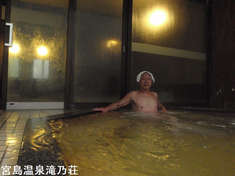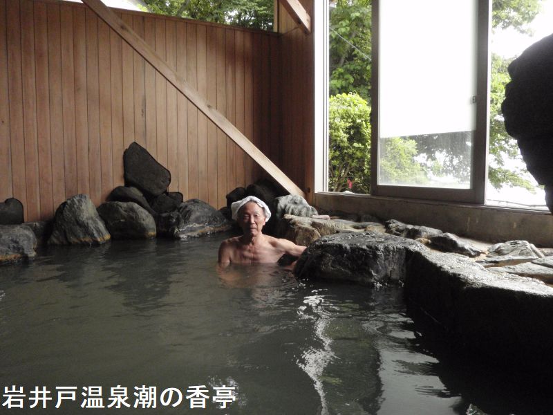 富山湾の向こうに雄大な立山連峰を望みながら入浴できる、源泉かけ流しの展望露天風呂がある潮の香亭は「氷見グランドホテル・マイアミ」の外湯でホテルの裏側の高台にあります。まるで茶屋のような、平屋木造の大人しくて落ち着いた佇まいです。浴室には池のように大きな露天風呂が据えられ、その手前に洗い場が並んでいます。浴槽の周りは大きな岩が囲っています。半露天と表現した方が実態にマッチしているかと思います。浴槽はこの大きな岩風呂のみです。女湯との境界にも大きな岩が組まれているのですが、ところどころに隙間があって、お湯自体は女湯と男湯でつながっているようでした。お湯は弱い貝汁濁りで心なしか僅かに黄色を帯びているようにも見えます。また湯中では黄土色の浮遊物がチラホラ舞っています。湯口周りや浴槽の湯面ラインなど、お湯と空気が同時に触れやすいところでは、温泉成分の酸化によって橙色に染まっています。お湯は塩味と共に、ほんのりとしたアブラ臭とヨード臭、そして臭素臭が感じられました。