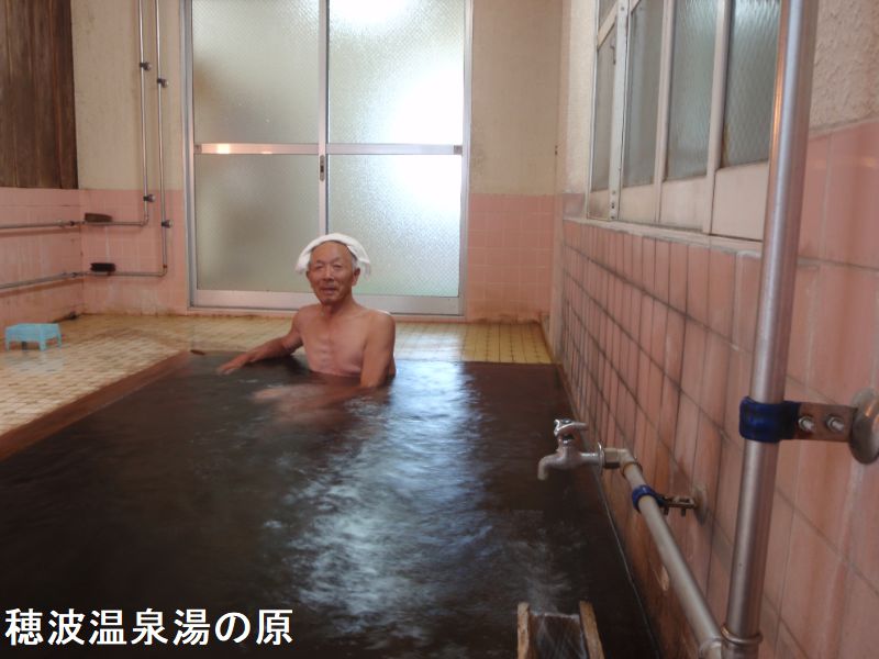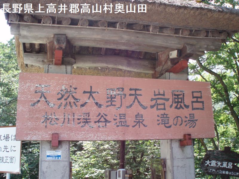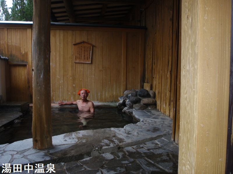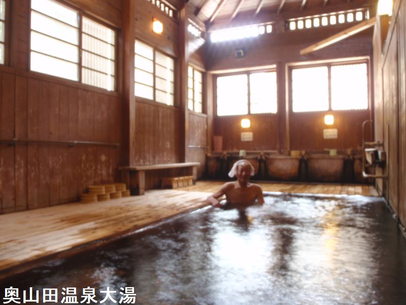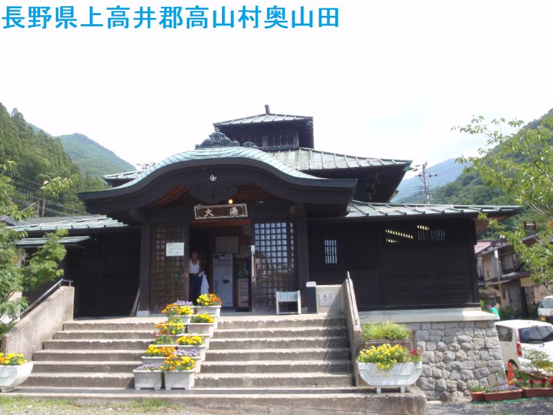 小布施町から県道豊野南志賀公園線を進んでいくと、松川渓谷の玄関口「山田温泉」に到着します。大湯は、開湯200年の歴史をもつ古湯に、桃山風建築の堂々とし佇まいいが温泉情緒を醸し出しています。浴室は、高い天井、壁、床、浴槽に至るまで総木造りです。洗い場は浴室奧にあり、カランなどは無く、壁沿いにあるお湯が流されている樋の所々に湯口があります。湯口にある木の板を手前に倒すとお湯が出る仕組みで、なかなか面白い造りです。浴槽は10人ほどが浸かれる大きさの「あつ湯」と、その隣に「ぬる湯」があります。ぬる湯は40度くらいで長湯可能ですが、浴槽は4人も浸かれば一杯の小さなものです。あつ湯は43度強とやや高めです。湯口は2箇所あり、隅にある木製の湯口からは高温のお湯が注がれ、カランから延びた樋を流れる、ぬるめのお湯が投入されています。やや青みがかった灰色微濁透明で微塩味、苦み、渋み、微硫黄味、微硫化水素臭を感じます。
