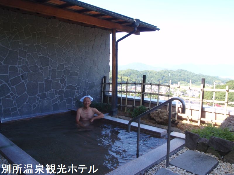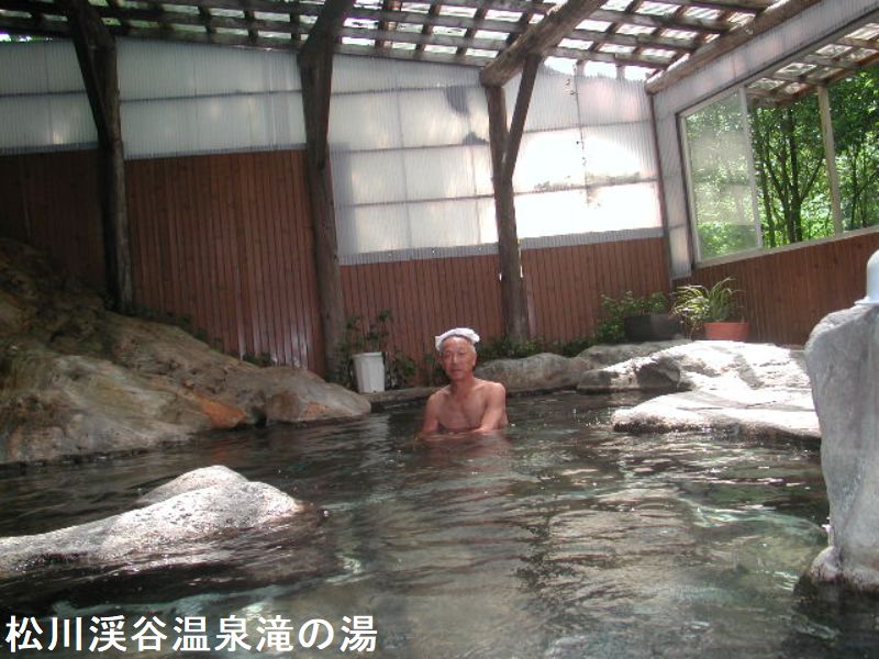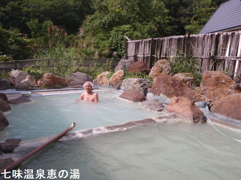 七味温泉に新しく日帰り入浴施設ができましたが、私が出かけた時は、未完成の時期で、施設の入り口に、「野天風呂お気軽にご利用ください」との立て札があったので、遠慮なく利用させていただきました。恵の湯は、2009年の夏に開業し、近くのホテル渓山亭が管理・運営しています。男女別の露天風呂と貸切露天風呂があり、風呂を竹柵で囲んだだけのシンプルな施設です。浴槽は広く、20人くらいは余裕で入れそう。川の方向には、遮るものがなく、とても広々と感じです。お湯は白濁していて、光の加減で青白くも見えます。浴槽の底には、硫化鉄が沈殿していて、お尻や足の裏が、墨に触れたように黒くなるのが珍しいですね。熱いお湯が投入されていますが、浴槽が広いせいか、ややぬるく感じました。風の音、鳥の声、松川のせせらぎの音、豊かな自然との一体感を味わう至福のひとときです。