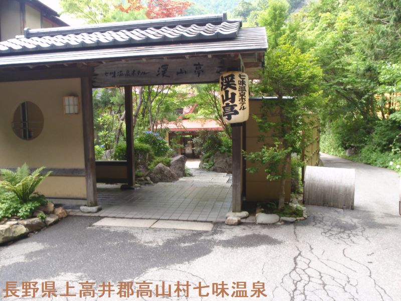松川渓谷に沿うように温泉地がある信州高山温泉郷の、8つある湯の中でも1番山深いところにあると言われているのが七味温泉です。「渓山亭」は、松川の上流にある源泉かけ流しの白濁りの湯で紅葉を楽しめる旅館です。秘湯ムードの七味温泉にあってひときわ立派な外観の純和風旅館です。とても瀟洒清潔でいい感じです。複数ある自家源泉は、白く濁った硫黄泉で、鉄分が多いため、沈殿した湯の華に触れた部分の肌が黒くなることもありますが、自然に落ちるので心配はありません。浴場は広い内湯と続きの露天。ほかに貸切露天の「せせらぎの湯」があります。内湯大浴場は深め岩風呂が1槽あり、巨大な岩から源泉の湯が湯滝状に投入され、やや熱めの湯が掛け流しになっています。ほぼ無色澄明の湯に白い湯花が大量に浮遊し、淡い苦味に弱めながら刺激感のある焦げイオウ臭がします。サラサラとキシキシのまじった硬い浴感の石膏系で、けっこう鮮度感があります。露天は岩風呂で、渓流方向に開いていますが、岩組がやや高いのでやや閉塞感あります。