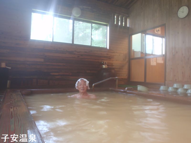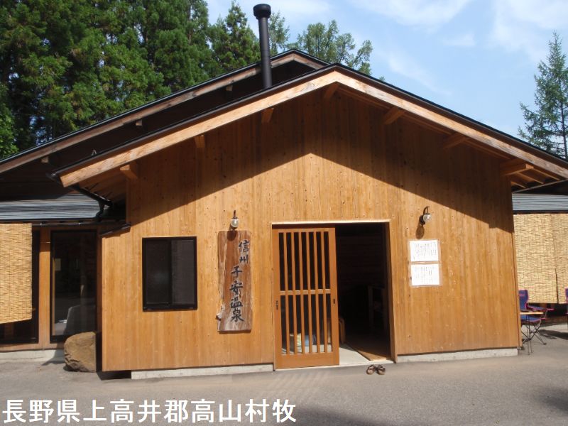 子安温泉は、高山村の県道351号山田温泉線沿いにあります。平成3年に開業した割と新しい温泉です。信州では珍しい黄褐色のお湯で、光を反射して緑がかつて見えます。よく温まるので、地元の人に大人気です。また子宝の湯として知られています。湯船も建物も全てが木製で、洗い場も蛇口もなく湯船に浸かるだけなのですが、泉質が良く、昔からの湯治場の風情があります。この温泉の特徴は「療養泉」。療養泉とは、温泉(水蒸気その他のガスを除く)のうち、特に治療の目的に供しうるものです。つまり、効果が見込めるとされる特定の成分が濃い、高いのグレードの温泉という事です。主に地元の方向けの温泉として営業していて県外から入りに来る人はそれほど多くないそうです。泉質はナトリウム塩化物泉で、口に含むと塩味がし、茶褐色の温泉は柔らかく熱めの湯です。