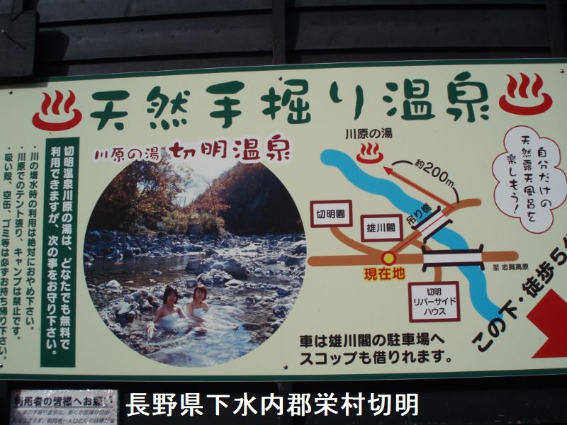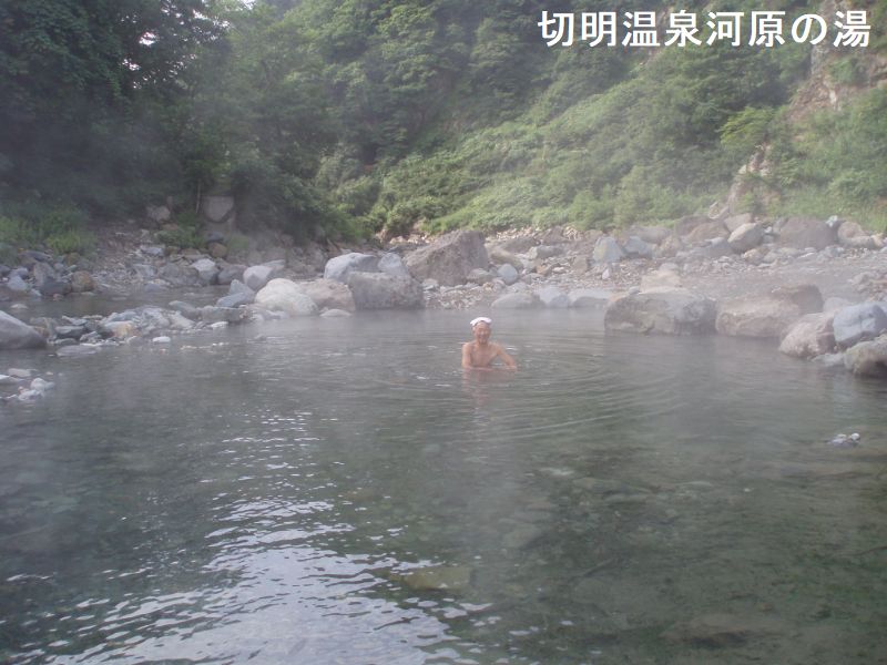 秋山郷は信州三大秘境といわれ、一昔前は陸の孤島状態でした。その秋山郷で最奥の地にあるのが切明温泉です。切明温泉にある旅館街の裏の河原に野湯があります。ここは、観光名所として有名になり、訪れる人も多いです。東京電力切明発電所に通じる橋を渡って立て看板の案内に沿って歩いていくと、河原一面お湯が湧き出る野湯があります。湯船は特に手作りしなくても、既に出来上がった湯船があり利用させて頂きました。岸辺に丸い人工的な湯溜まりがありましたが、熱くて入れませんでした。