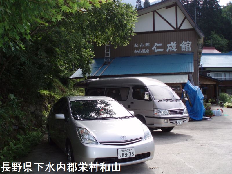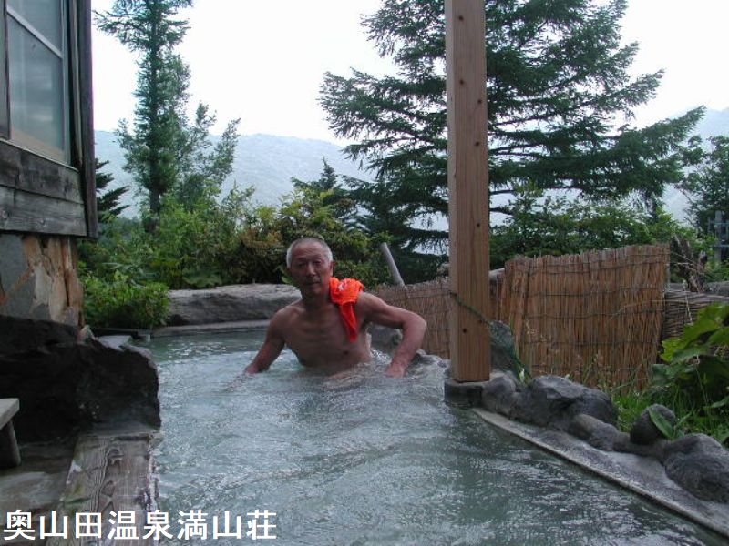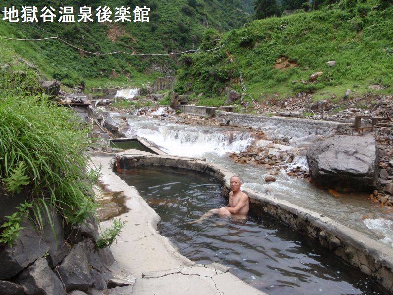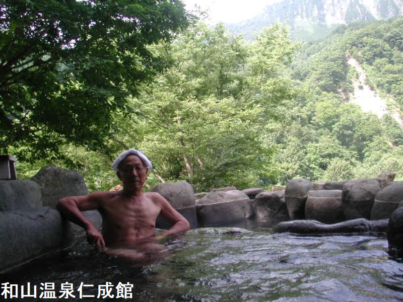 秘境「秋山郷」は長野県の北東に位置し、信濃の三大秘境のひとつで、平家の落人の隠れ暮らした里であります。苗場山(2145m)と鳥甲山(2088m)に挟まれた山峡!日本でも有数の豪雪地帯にあり、中津川渓谷沿いにあります。和山温泉「仁成館」は、鳥甲山を眼面に望む絶景の地で、江戸時代に秋田のマタギによって発見されたと云われています。一帯では今でも冬になると、マタギの流れをくむ村の猟師が熊狩りなどを行っています。銘石でなく河原の石を拾って置いたような素朴な露天風呂ですが、かえって周囲の自然に溶け込んでいます。