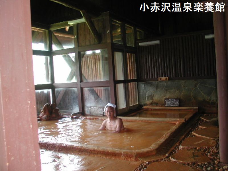秘境と云われた秋山郷は、中津川の深い渓谷であります。渓谷の入口が新潟県で、その奥が長野県になっています。小赤沢温泉は、県境の長野県側にあります。小赤沢は苗場山の西の登山口であり、この温泉は、登山者にもよく利用されています。小赤沢温泉の湯は、療養泉というだけあって、効能成分は普通の鉄鉱泉の数倍はあるといわれ、又、真っ赤な湯が数分おきに音を立てて噴出する間欠泉になっています。湯は温めなので、時間を掛けてゆっくり入浴を楽しむのが良いと思います。