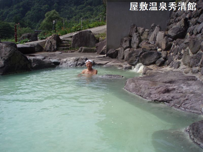 秀清館は、中津川の西岸に湧き、一説に平家の隠し湯とも伝わるボリュームのある山間にある一軒宿です。江戸時代、鈴木牧之は、「秋山記行」で、秋山郷の里人の極貧の暮らしを記しました。現在近くに大秋山集落の供養碑が立ち民俗資料館もあります。秋山郷は、平勝秀が落ち延び、ここ屋敷に逃れ住んだことから、平家伝説が残っております。硫黄分が多い温泉で、やや白濁し良く温まる良質の温泉です。露天風呂は混浴で、廻りから丸見えの宿の入口にあり、巨岩を配した豪快な造りです。