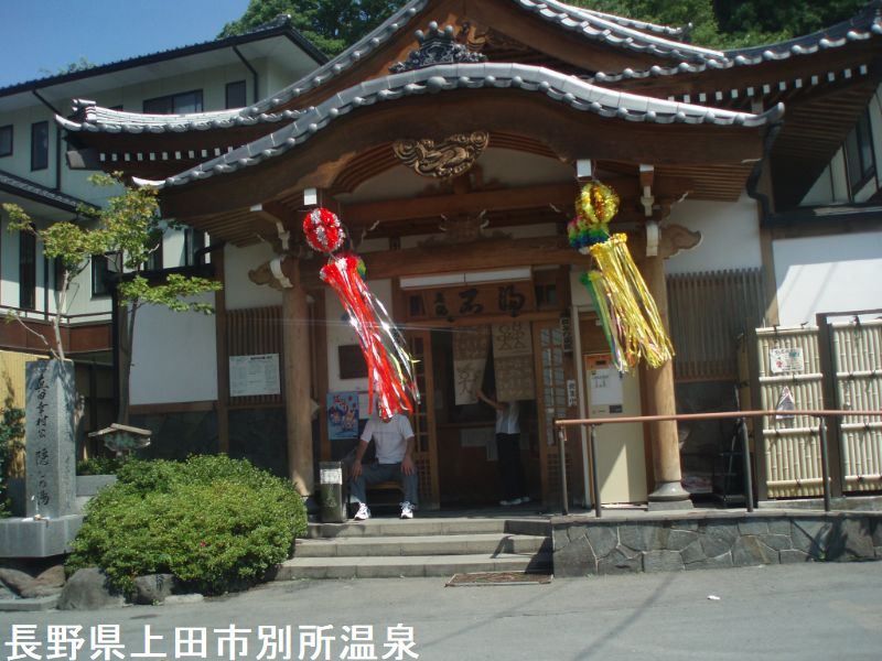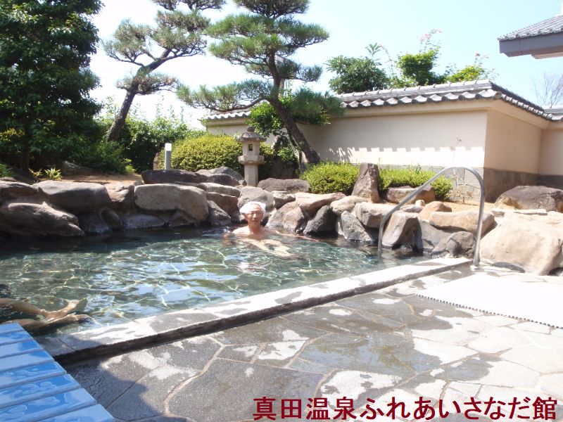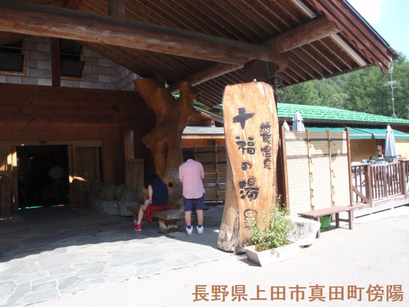真田氏の館をイメージした純和風六文銭入り瓦が印象的な総合温泉施設は、戦国武将の真田氏の館をイメージした純和風の建物で、瓦には六文銭をあしらっています。上田から菅平に向かう途中、真田一族発祥の地に、山を背に堂々とした和風の建物が立っています。浴場は、さまざまな機能付きの浴槽が揃う大浴場と、景色のよい露天風呂があり、のんびりと長湯が楽しめます。浴室は内湯と露天があり、内湯は20人サイズの大浴槽と気泡湯にサウナなどがあります。内湯では浴室入口のかけ湯が源泉かけ流しになっていて、浴室内も軽いアブラ臭が漂っています。浴槽のお湯は循環なので、残念ながら特徴は薄めなものになっています。露天には6人サイズの岩風呂があります。狭いながらも庭園風の庭になっていて雰囲気があります。湯口からはややぬるめの源泉が出ていて、硫黄混じりのアブラ臭があります。こちらも浴槽内では循環されているので、実際のお湯はほんのり何かの香りがする程度になっているのが残念ですが、内湯よりは露天のほうがレベルは高そうです。