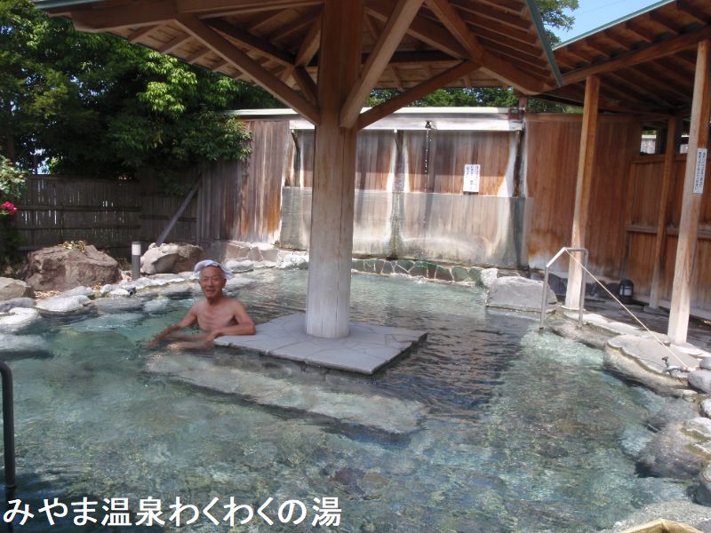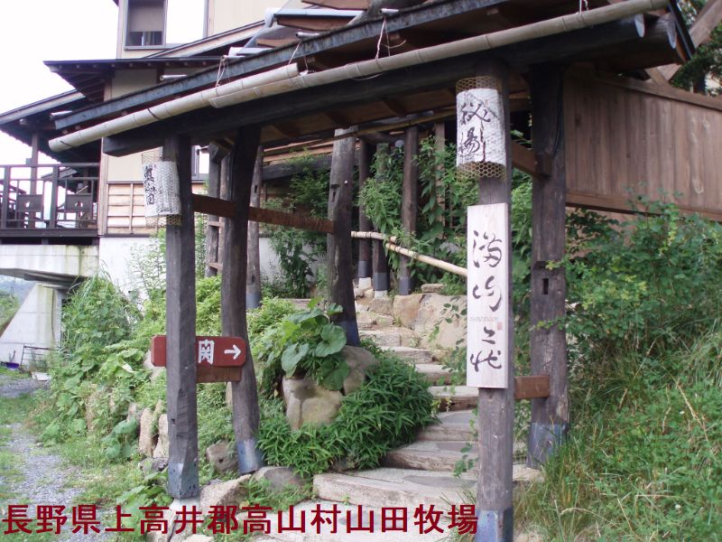 草津志賀道路(国道292号線)の長野県側終点近くに「みやま温泉わくわくの湯」はあります。志賀高原の豊かな自然に周りを囲まれた四季折々の草花が季節ごとの彩を添えるふもとに位置しています。施設は民宿にある露天風呂の事です。日帰りも長期の滞在もできる民宿です。ぱっと見では温泉が沸いているような場所には見えません。露天風呂は一つだけの小規模な温泉で、硫黄の匂いがするやや温度が高い温泉です。硫黄色に染まった湯口の下に、籠の様なものを置いて、不純物を取り除いています。掛け流しですが、湯がおとなしい感じなのはそのせいかもしれません。湯は少し白濁した感じで湯の花も舞っています。湯口付近は猛烈に熱いですが、大きな湯船の奥の方は適温で快適に浸かれました。柔らかいさっぱりした湯で掛け流されています。露天は25人ぐらい入れる大きさの岩風呂ですが、目隠しがあるので展望はよくありません。