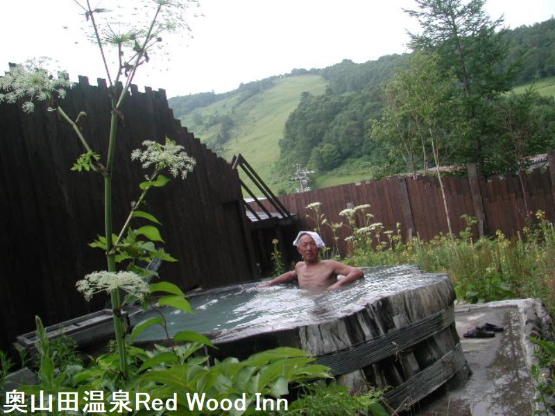 志賀高原の主峰笠岳の南麓に広がる山田牧場は広さ159ヘクタールのスケールで、北アルプスの眺望と牛の放牧は、北欧ムード漂う高原です。冬にはスノーボーダーやスキーヤーの天国に変わります。奥山田温泉Red Wood Innは、アメリカの国立公園セコイヤナショナルパークから輸入した樹齢1650年、直径5メートルの巨木を、幾多の困難を乗り越えて日本に運び、内装のいたる所に使用し、75センチの梁や、太い幹を丸ごと使った直径3.2メートルの露天風呂にして造られたのがレッドウッドインです。それを刳り抜いた丸太の露天風呂がRed Wood Innの自慢です。夜空を見上げながら、また朝霧の中で入る露天風呂は格別です。雑誌やTVでも数多くとりあげられている穴場の温泉です。