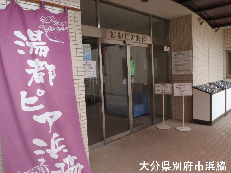 鉄輪と並び別府温泉発祥の地と呼ばれる浜脇温泉、名前の由来は、浜から温泉が湧き出る様子から「浜わき」の地名が生まれたと伝えられています。昭和初期には浜脇東・西温泉が合併し「浜脇温泉」となり、多くの利用者で賑わいました。ヨーロッパのクアハウスがモデルの温泉で、健康管理を目的とした多目的温泉保養館として、平成3年にオープンした「湯都ぴあ浜脇」は、市営の温泉にしてはめずらしく、ちょっとしたスパよりもお風呂の数が多い印象です。かぶり湯・気泡浴・寝湯・全身浴・圧注浴・うたせ湯・運動浴・寝湯・歩行浴・サウナ、が楽しめるます。ちょっとした「市民憩いの場」のような整備された舗装スペースに建つ立派な近代的建物で、その2階にある市営の温泉センターです。オフィスビルのような味気ない入口で「本当にこの中に入浴施設があるの?」と一瞬入館を躊躇してしまいます。