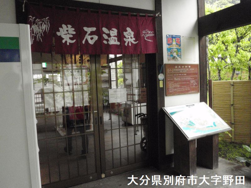 江戸時代に「柴の化石」が見つかり「柴石」と呼ばれるようになったとも伝えられています。 療養効果の高い温泉地として国民保養温泉地、国民保健温泉地として指定されており近くには明礬温泉へとつながる森林遊歩道があります。 平成9年4月には自然景観にも恵まれた「ふれあい・やすらぎ温泉地」として、装いも新たに オープンしました。温度の違う2つの温泉や露天風呂・ 蒸し湯があります。内湯はかなり広く、木造の太い柱と梁が組み合わさった高い天井の下に長方形の風呂があり、2つに仕切られ浴槽には温度が違う温泉が張られています。「熱湯」は43℃、「普通湯」は41℃位です。あつ湯は別府温泉初心者が入るには至難のワザで、普通湯も少し熱めに感じます。湯は青味がかった白濁で、僅かにキュキュ感があります。内風呂から繋がる露天風呂は小規模なものでが、ぬるめでゆったりと浸かることが出来ます。露天風呂の隣にはむし湯があり、足元に敷かれた竹の下を源泉が流れ蒸気が出る仕組みになっています。入って1分もしない内に全身から汗が噴き出てきます。