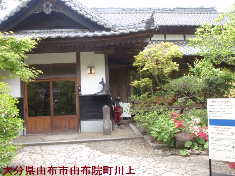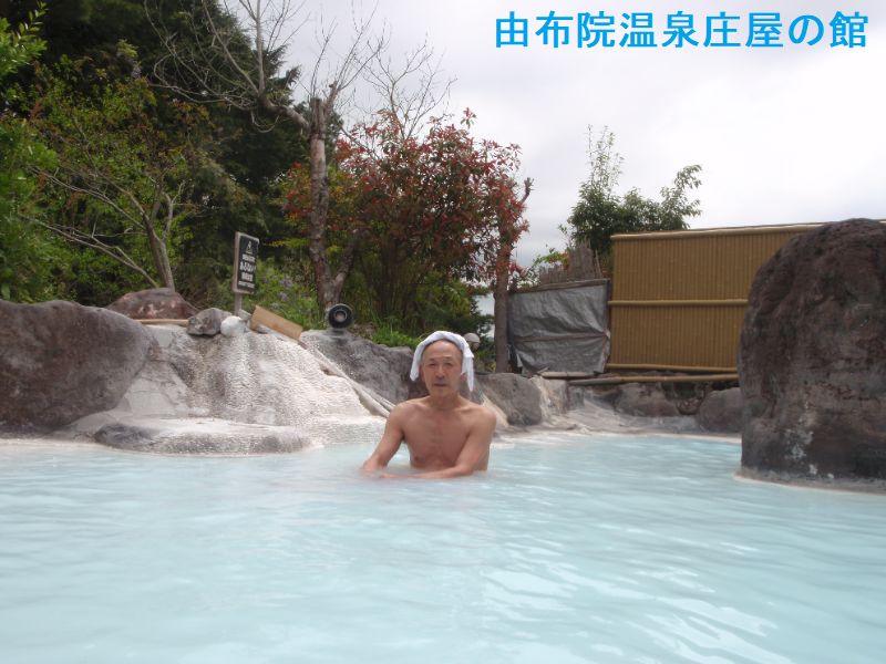 湯布院温泉は、すぐ側にそびえる由布岳の恵みを受けた豊富な湯量を誇る温泉です。青い湯と析出物の白というコントラストがすばらしく綺麗です。高台の中腹に位置する「ゆふいん束の間」(庄屋の館)は、5000坪の広大な敷地には明治時代の豪族の迎賓館を移築した本館は、趣のある一楝建てで、離式の2階建てがあり、別荘を訪れたような気分が味わえます。この宿には内湯が無く、大きな露天風呂と貸切の露天風呂が2ヶ所 のみです。「大露天風呂」と名付けられている通り、岩造りの露天風呂は40人以上浸かれるだろう本当に大きなものです。そこに少し白みがかったきれいな水色の湯が溢れています。湯をよく観察すると、湯船の底などは湯の成分でクリーム色にきれいにコーティングされています。湯口では洗濯板のようにびっしりと湯の花が付いていました。湯の成分が濃いのでしょう。