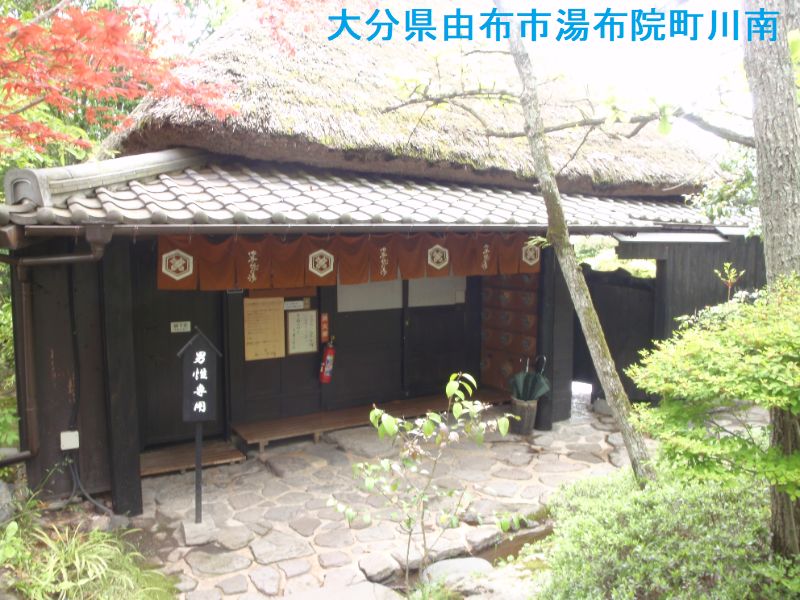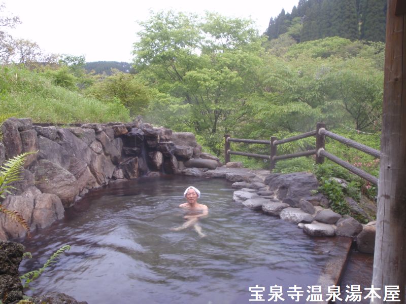 宝泉寺温泉の歴史は古く、約1000年以上。空也上人が開いたといわれる温泉で、伝承では大地震の折、空也ゆかりの大杉の根元から湯が湧き出たとあります。宝泉寺という地名の由来は、そのいで湯に空也上人を祀る寺院、宝泉寺を建立したことに因みます。宝泉寺とは読んで字の如く、宝の泉であり、空也上人が授けてくれたものであると村人が考えたためです。「湯本屋」は、大分自動車道・九重インターから車で約15分の場所にあり、周辺には「町田バーネット牧場」や、「宝泉寺温泉」、「九重ふるさと館」などの観光スポットが点在しています。浴場は壁があるものの一部は自然の岩壁で滑滝のように上方から水が流れています。雑木も人工的とはいえいい感じで植えられており気分が落ち着きます。源泉温度は54度あり自然冷却しているようですが、客が少ないとドンドン熱くなる事はなんとなく分かります。泉質は単純温泉、無味無臭で特徴はないのですが人は少なくゆっくりできたので満足できました。