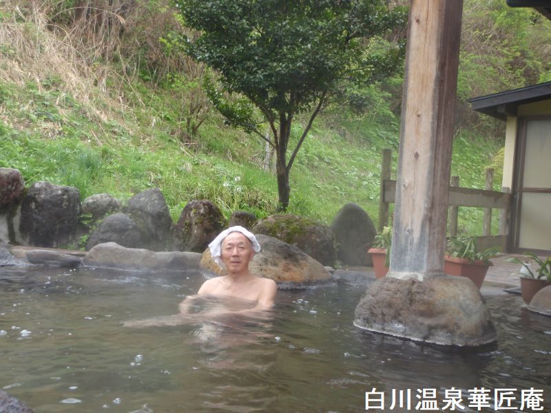 熊本県阿蘇郡南小国町の白川温泉郷にある温泉旅館で秘湯と称される白川温泉に建つ温泉宿です。都会の喧騒、温泉街のざわめきを通り抜け佇む隠れ宿です。山・川・田んぼに囲まれた自然豊かな場所で、穏やかなひと時を過ごすことができるのが魅力です。湯の華舞う源泉掛け流し湯は、近隣の温泉郷屈指の良泉です。黒川温泉の温泉街からはちょっと離れていますが、その分自然の中でひっそりと体を休ませたい方には良いと思います。小さな温泉地ながら、野趣あふれる露天風呂を持つ宿あり、1日8組限定と宿泊者が少なく館内の露天風呂は貸し切り状態で利用できる確率が高いので、お宿だけでも大満足できます。内風呂の浴室の床が畳敷きになっているので冷たさがありません。床に座り込んで体を洗うのにちょうどよい位置にカランがあります。露天風呂へは内風呂からドア越しに直接行くことができます。内風呂より広い大きさで、源泉掛け流しです。ウグイスの鳴き声が聞こえ、お湯の温度も場所によって熱め、ぬるめと楽しめます。久しぶりにいい温泉を体感しました。