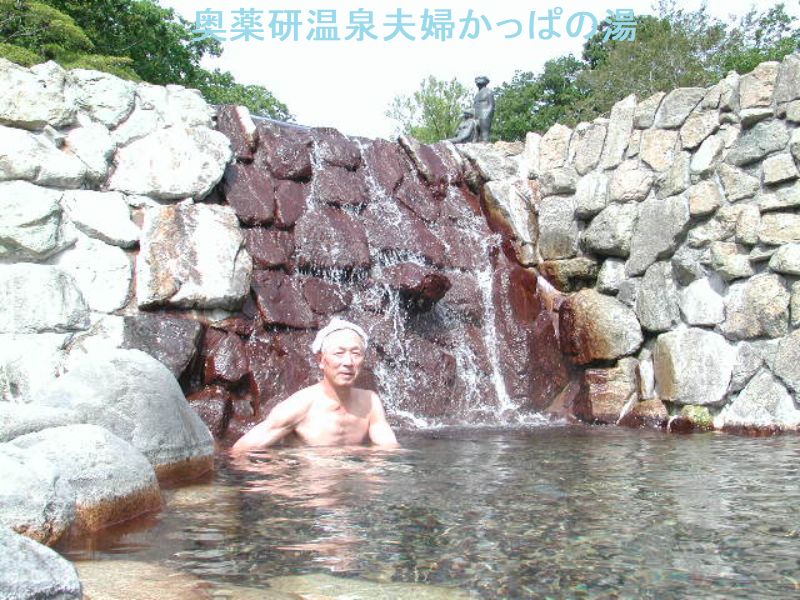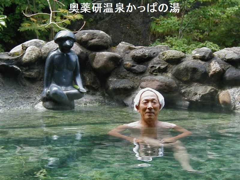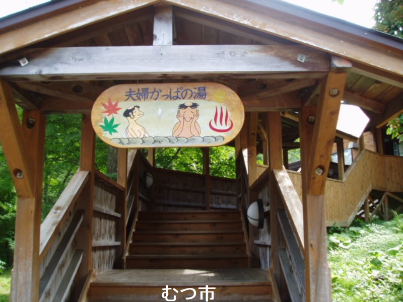 海に囲まれた下北半島の山中、イカ漁の盛んな漁港のある大畑町の中心部から大畑川を遡ると幾つかの旅館が建ち並ぶ薬研温泉があります。その先に奥薬研温泉がある。ここは薬研渓流を形成する大畑川と支流の合流点で、渓流沿いの湯船から眺める新緑・紅葉が美しいです。夫婦かっぱの湯は石の壁に囲まれていて男女別になっています。薬研渓流の本流を眺めながら、のんびり入浴出来ました。ここはかつて湯ノ股温泉と呼ばれ昔から薬研温泉の外湯として地元の人や湯治客に親しまれて来ました。露天風呂に行くにはレストハウスの中を通って階段を下ります。周囲を城壁のように石の壁で囲み、渓流側を開けてあります。綺麗に管理された広い湯船に透明で適温の湯がふんだんに注がれていました。