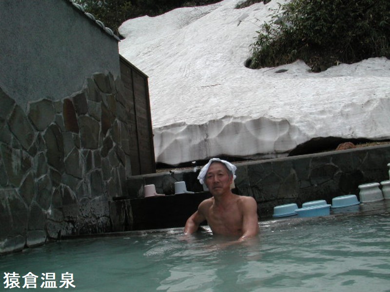 元湯猿倉温泉は、高田大岳の南麓、猿倉沢の渓畔に建つ静かな山間の一軒宿です。国道から脇道に入って400mほど進みますと、広々とした敷地にロッジ風の新館の建物と昔の校舎を思わせるような木造二階建ての本館が並んで建っていました。フロントのある本館入口には湧き水が引かれ、ここを高田大岳などへの登山の基地にしているクライマーが喉を潤したり給水したりしています。敷地の前は渓流が流れていて野趣たっぷりでした。猿倉温泉は毎分3000立の豊富な湯量を誇り、一部は13km下にあります十和田湖温泉郷にも配湯しています。露天風呂は青っぽく濁りのある湯がふんだんに溢れていました。