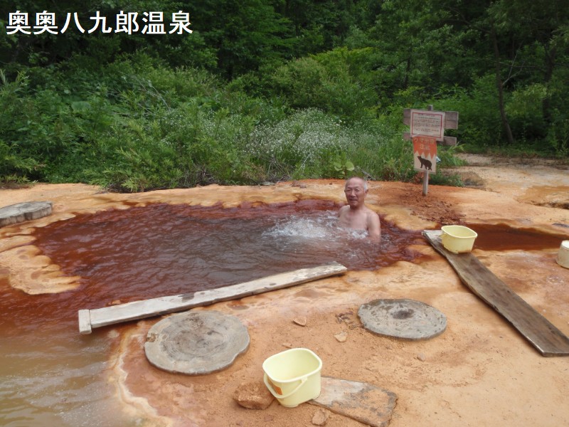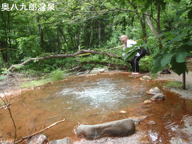 八九郎温泉入り口の手前約50mの所に、小さくて且つ目立たない手書きの看板があります。ここが奥八九郎温泉の入り口で、細いダートの道が奥へつながっています。砂利道に入って2.7キロ途中の分岐2か所は共に左へ、最後は獣道のようです。この辺りは特に熊の出没が多いとの事でしたので、大声で叫びながら歩くなどの対策が必要です。バキバキと小枝を踏みながら進むと、現れました一坪ほどの湯だまりが地下からボッコンボッコン適温の湯が沸き出しています。但し入浴するのは至難の業です。ご覧のように周りは泥状態で、泥まみれになります。三つの八九郎温泉の巡り方として、ここは一番最初に入るべきでしょう。二番目に奥奥八九郎に入り、最後に一番手前の八九郎に入ると綺麗な体で帰れます。