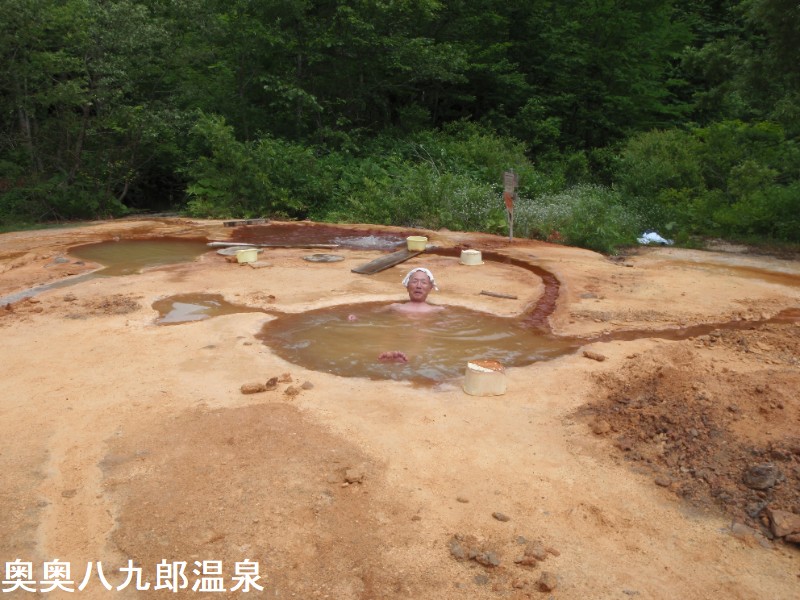 八九郎温泉の名前の由来は、八九郎という集落より付けられたそうです。温泉好きの中ではもう知らない人はいないのではないかというほど有名な温泉です。秋田県の最北端鹿角市小坂町にこの温泉があります。際立った看板や道案内がほとんどないので、詳しく説明できませんが、小坂町の舗装道路を進んで奥八九郎温泉へ向かうダートに入らず、そのまま舗装道路を左にカーブし300m位進むと向かって右側の道路添いに集落のごみ置き場があり、そこに車を止めてその裏の農道を奥に進みます。奥まったところに、農業用のビニール・ハウスが現れます。これが八九郎温泉です。集落の人たちによってきれいに管理されていて、とても綺麗で温泉も最高でした。浴室へ入ると抹茶色に染まった浴室と湯船が登場、この時点でちょっと興奮状態になります。析出物でこんもりとした湯船は茶色い陶器のようにも見えます。湯量はとにかく多く、これでもかというほどザバザバと投入されています。湯温が高い事もありお湯の中では炭酸をあまり感じられませんが浴感はやわらかく本当に素晴らしい温泉です。