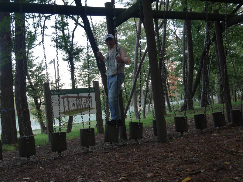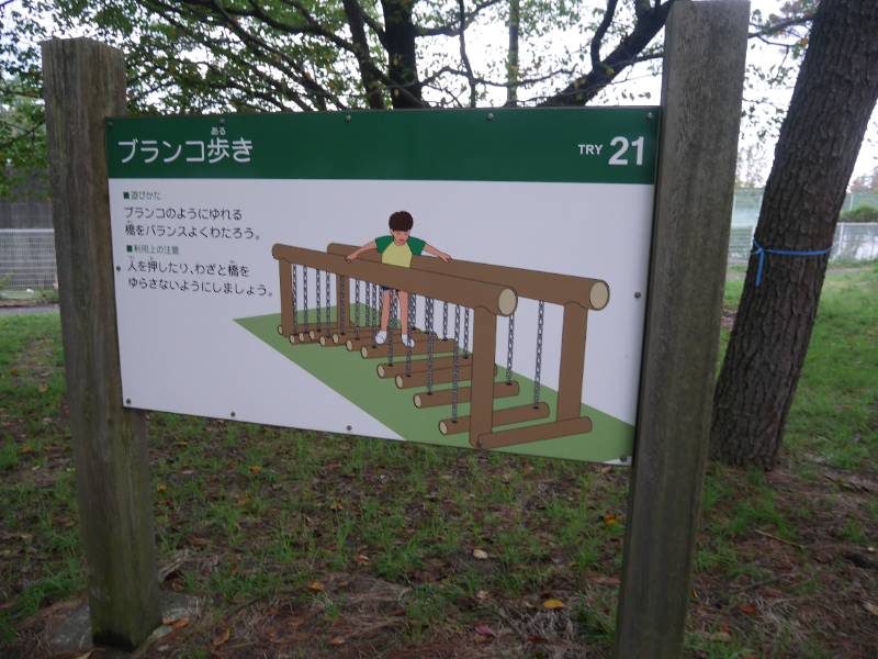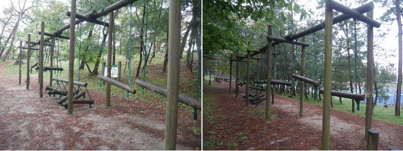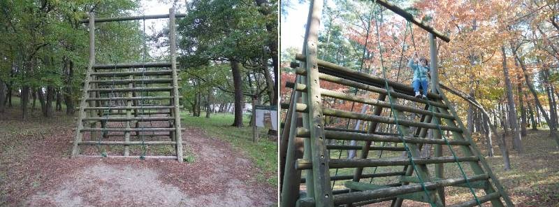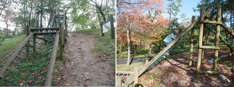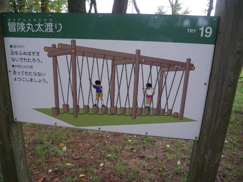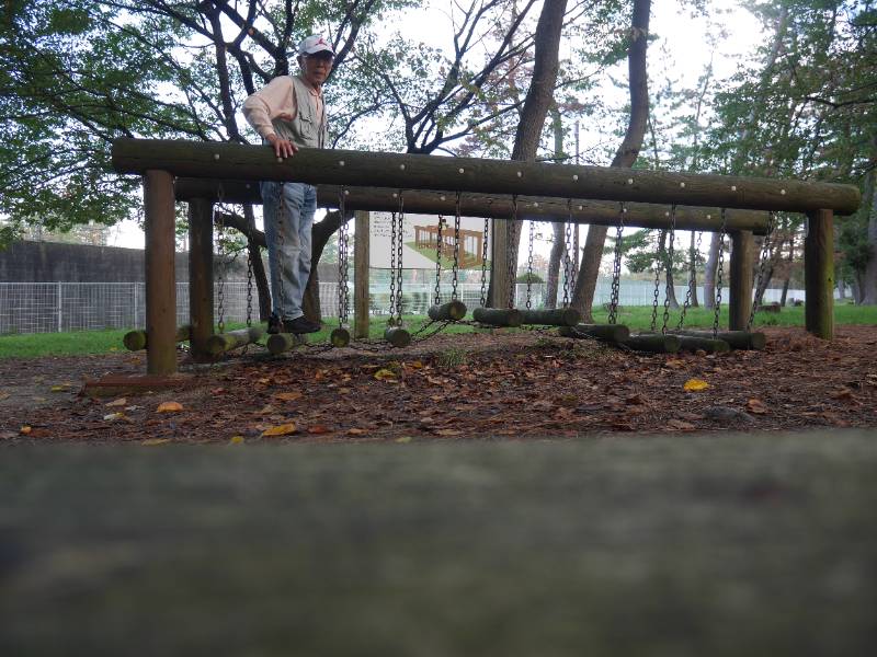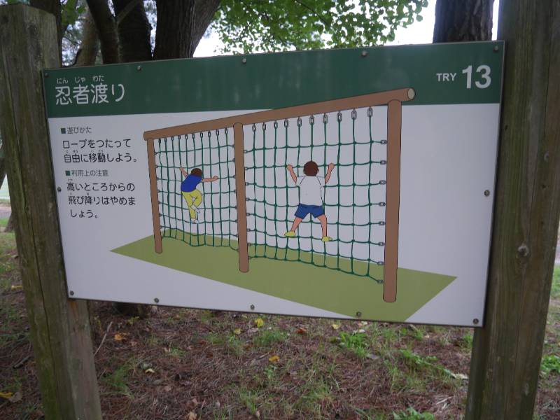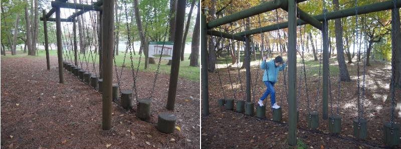 「忍者渡り」という遊具は、おそらく「忍者」の名称がつく、複数の吊り輪や丸太をバランスを取りながら渡っていくタイプの遊具の通称です。明確な定義はありませんが、忍者屋敷の壁などをよじ登るイメージから、子どもが「忍者ごっこ」をしながら挑戦できることからそう呼ばれることがあります。落ちないようにバランスを取りながら進む必要があり、バランス感覚を養うのに役立ちます。バランスを取るために手足を使ったり、体を支えたりするので、全身運動になります。「忍者渡り」のような遊具は、遊びながら「協応動作」や「空間認知力」を養うことができます。