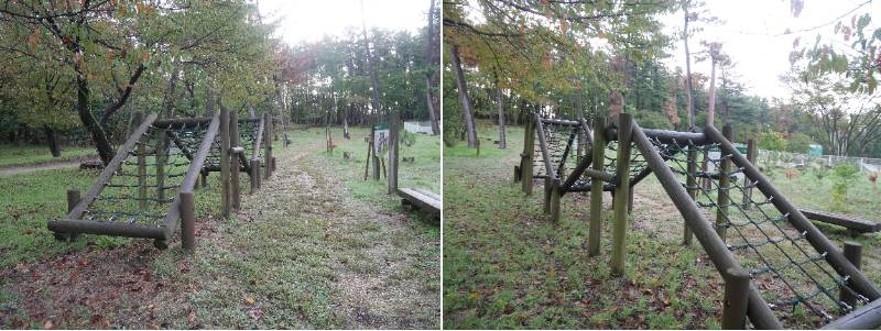 アスレチックの「揺れる橋」は、一般的に「吊り橋」や「ロープブリッジ」と呼ばれ、木の板やロープで作られた、地面から離れて揺れながら進む遊具です。フィールドアスレチックの定番遊具であり、渡る際にはバランス感覚が求められます。木の板とロープで作られ、地面との高低差があるものが多く、揺れが大きいためスリルがあります。複数のロープと、踏み場となる木やロープで構成された橋で、これも同様に揺れながら進みます。「ロープウェイ」や「ジップライン」なども、吊り橋に近い要素を持つことがあります。
