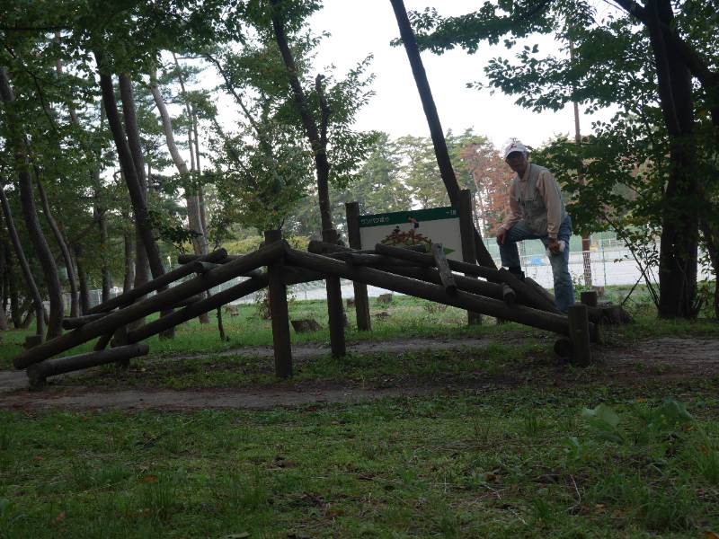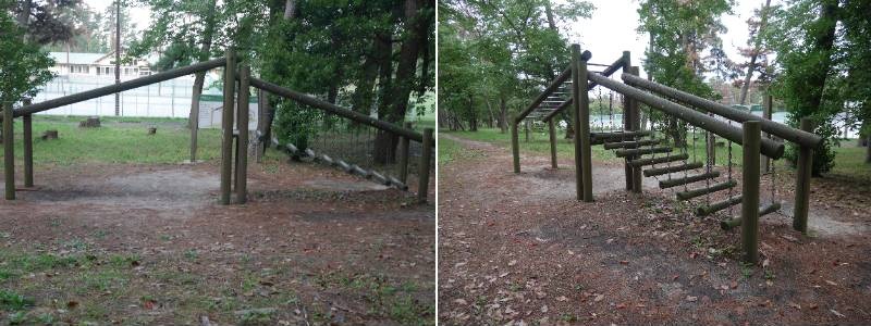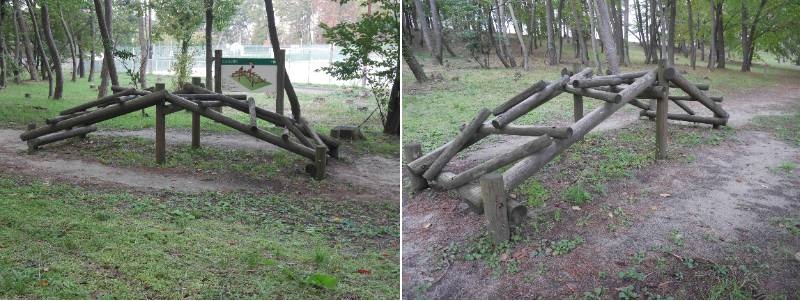この園庭遊具は木製のブリッジです。足場の丸太が鎖に繋がれて浮いているため前後に揺れます。この前後揺れの中、ブリッジを渡ることで3歳~12歳の子供たちに楽しんでもらうことが出来ます。「丸太ブリッジ」は、丸太をそのまま、または組み合わせた橋のことです。主に、丸太を一本のまま、もしくは複数本を組み合わせて、隙間なく頑丈に作られます。また、丸太を伐採・切断する際の「玉切り」作業における特殊な切り方、特に丸太が折れる危険性がある場合の安全な切り方としても使われることがあります。複数本の丸太を束ねて橋脚とし、さらにその上に丸太を並べて橋板とする構造が一般的です。