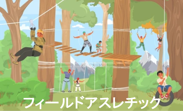 フィールドアスレチックは、自然環境の中で障害物を組み込んで造られた様々なアトラクションを通過し、冒険的要素で運動能力を高める(走行、跳躍、投擲など)遊戯施設を指す。1970年に実業家の井坂弘毅(日本フィールドアスレチック協会理事長[1])によって考案されました。名称は英語のfield(野外)とathletic(運動)を組み合わせた造語です。実際の英語では、類似した施設をアドベンチャーパーク、オブスタクルコース、ロープスコースなどと呼んでいます。