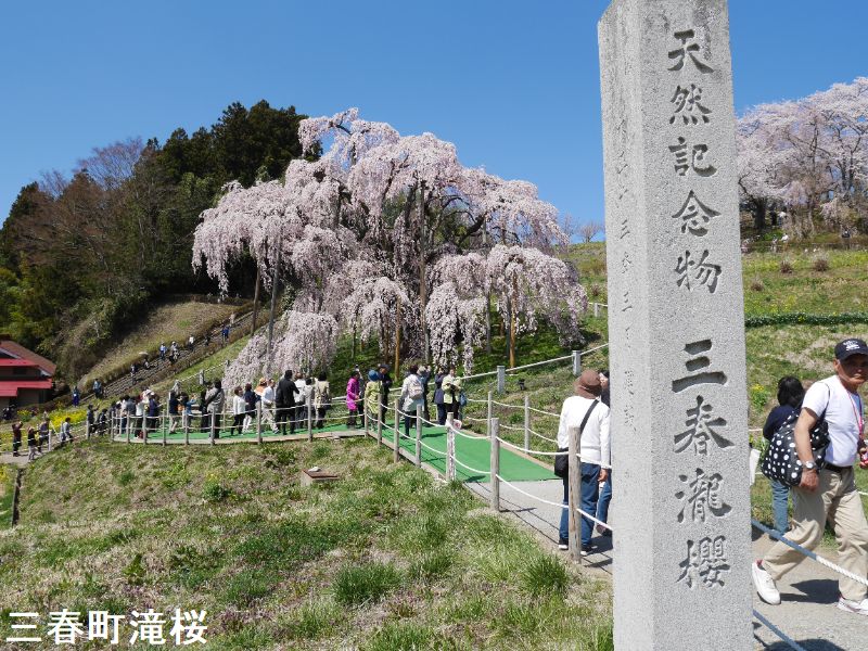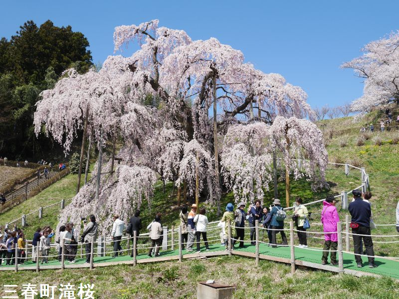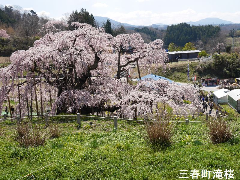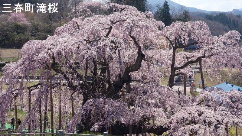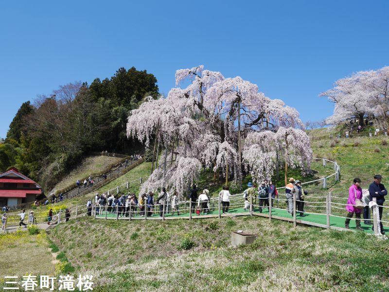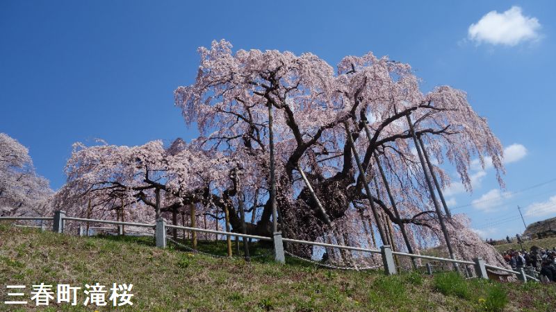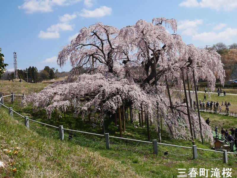 東北の小鎌倉とも呼ばれる城下町、三春は、その名が示す通り、三春には三つの春が同時にやって来ます。最初に梅の花が咲き、続いて桜が満開となります。そして今度は桃の花が咲きます。羨ましいほどに美しい春が、この土地を彩ることになるのです。その中でも最も壮観なのは、やはり「滝桜」でしょう。一説には樹齢一千年を超えるとも言われるしだれ桜で、花の頃には全国から訪れる桜見物の人たちで、あたりは大変な賑わいとなります。この滝桜はエドヒガン系の紅枝垂桜で、大正11年、国の天然記念物の指定を受けました。日本を代表する桜の巨木で、日本三大桜の一つです。岐阜県の淡墨桜とともに東西の横綱に位置づけられています。