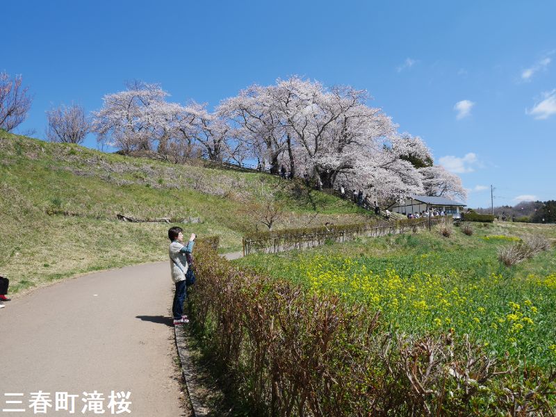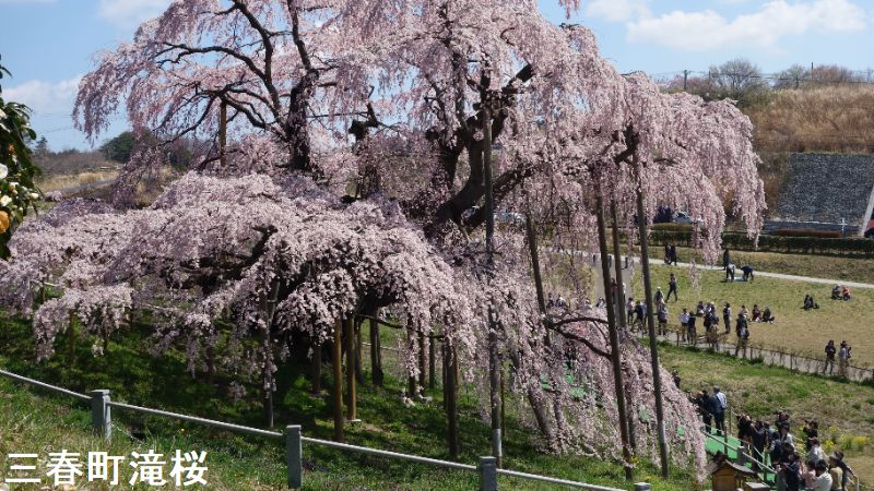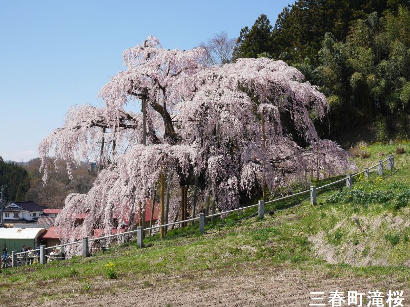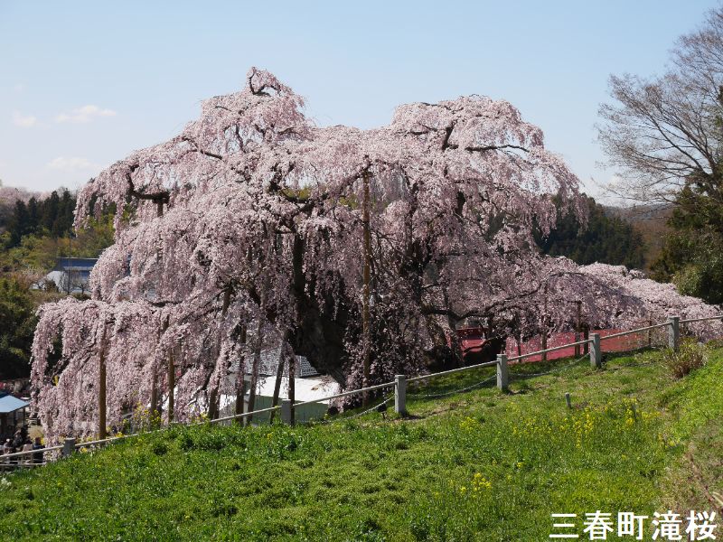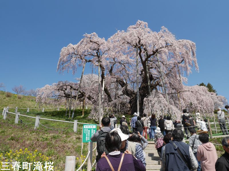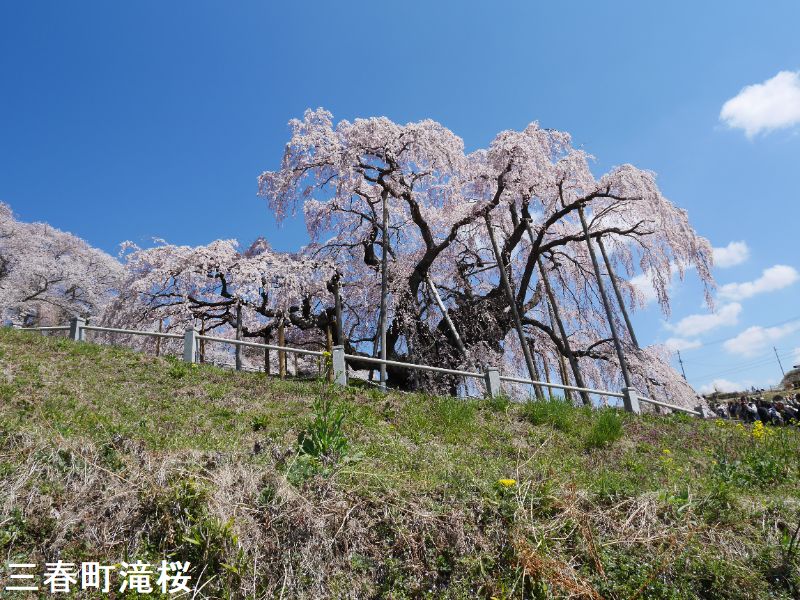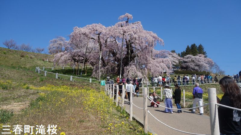 東北の小鎌倉とも呼ばれる城下町、三春は、その名が示す通り、三春には三つの春が同時にやって来ます。最初に梅の花が咲き、続いて桜が満開となります。そして今度は桃の花が咲きます。羨ましいほどに美しい春が、この土地を彩ることになるのです。その中でも最も壮観なのは、やはり「滝桜」でしょう。一説には樹齢一千年を超えるとも言われるしだれ桜で、花の頃には全国から訪れる桜見物の人たちで、あたりは大変な賑わいとなります。この滝桜はエドヒガン系の紅枝垂桜で、大正11年、国の天然記念物の指定を受けました。日本を代表する桜の巨木で、日本三大桜の一つです。岐阜県の淡墨桜とともに東西の横綱に位置づけられています。