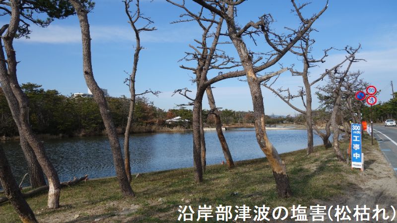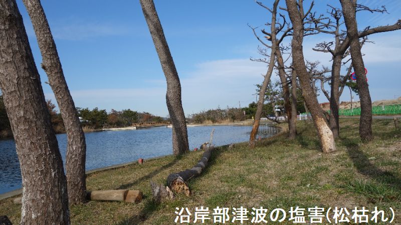 大津波の発生は、地域住民が長年にわたって育み、潮害、飛砂・風害の防備機能の発揮や白砂青松の美しい景観を形成してきた海岸防災林をはじめ太平洋沿岸地域に壊滅的な被害をもたらしました。相馬市松川浦地区は、県立自然公園にも指定され、官民合わせた潮害防備保安林として、130ha にも及び塩害の防止や風速の緩和などの効果を発揮していましたが、震災による津波(相馬観測所 7.3m)被害によりクロマツ林が流失しほぼ壊滅状態となりました。いわき新舞子では、およそ 7.6m の津波に襲われましたが、海岸防災林の一部に被害があったものの、流失せずに津波漂流物を捕捉するなどの効果を果たしました。しかしながら、塩害や地下水の影響等により樹勢の衰えや枯死するものが現れました。