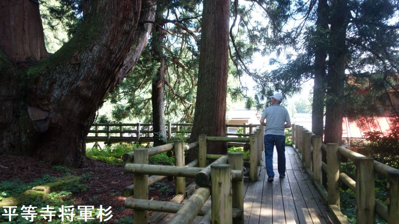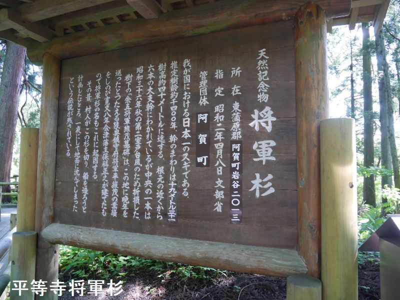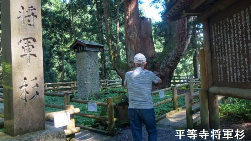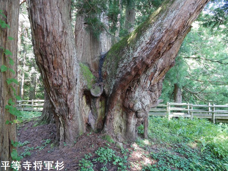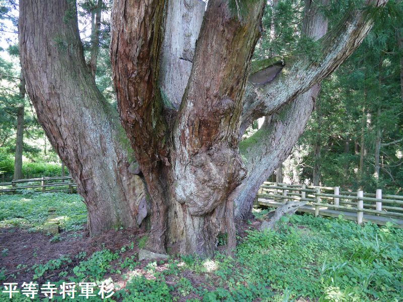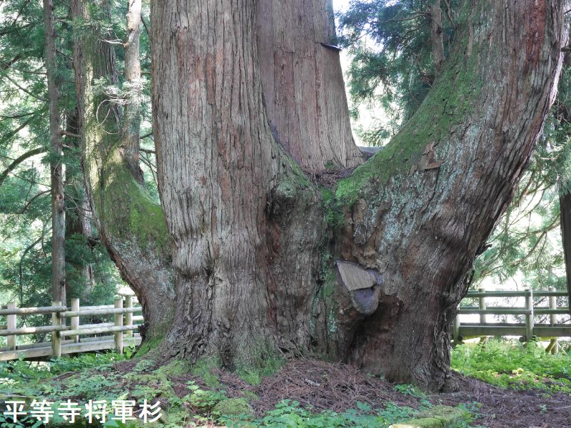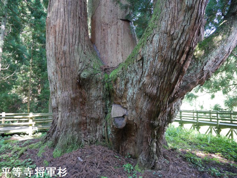 平等寺の東隣、岩谷集落を見下ろすところにどっしりと根を張り、四方に太い枝を伸ばした将軍杉は、樹齢が推定で1,400年、幹周19.31メートル、樹高38メートルを測ります。平成12〜13年度に環境省が行った「全国巨樹・巨木林フォローアップ調査」での杉の部において、それまで日本一であった鹿児島県屋久島の縄文杉(16.1メートル)を抜いて日本一の巨木となったものです。