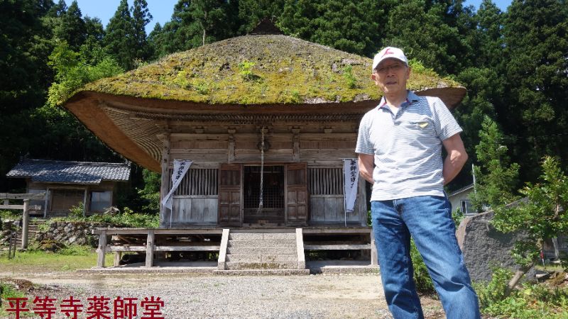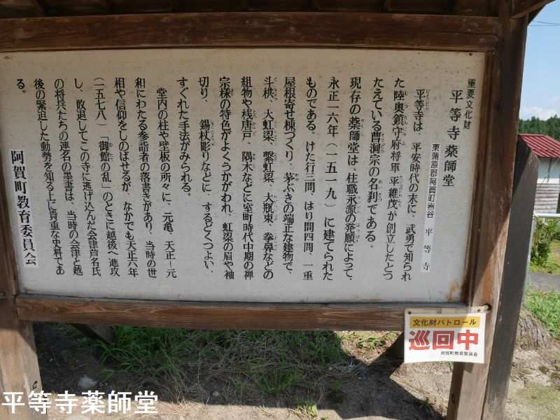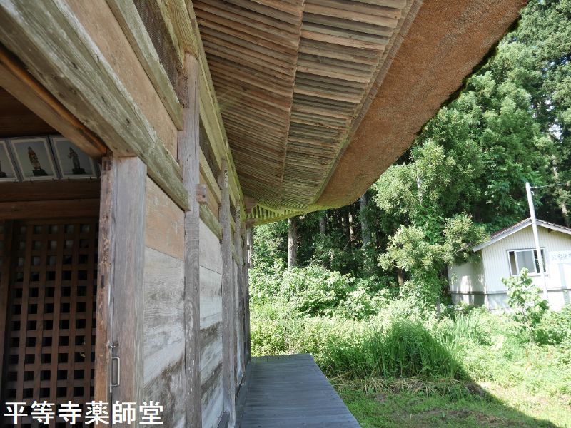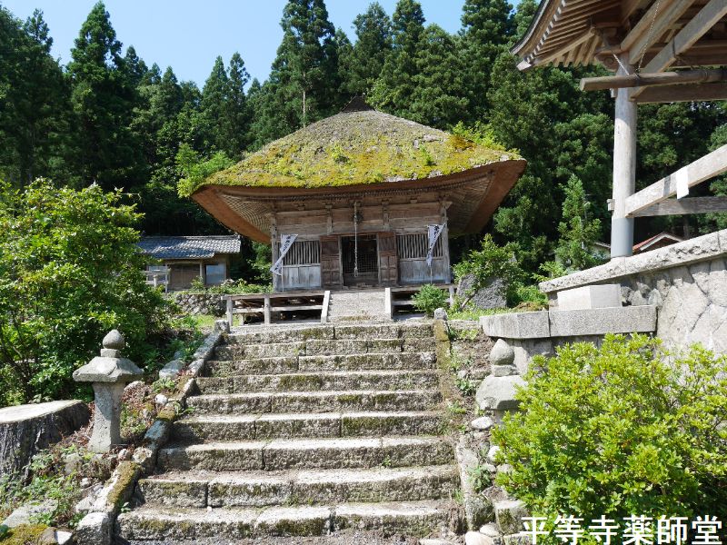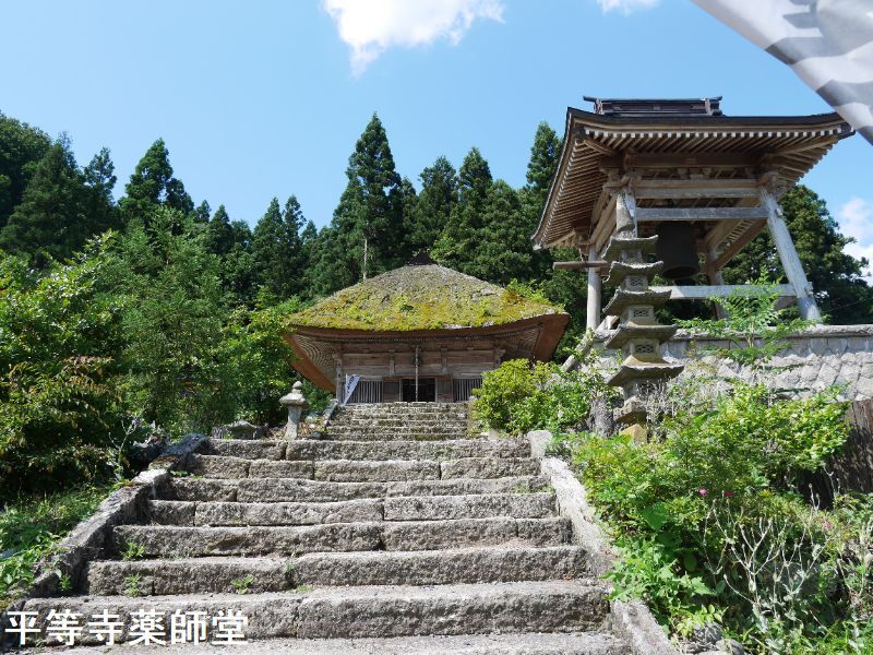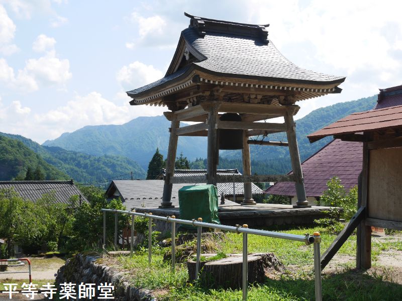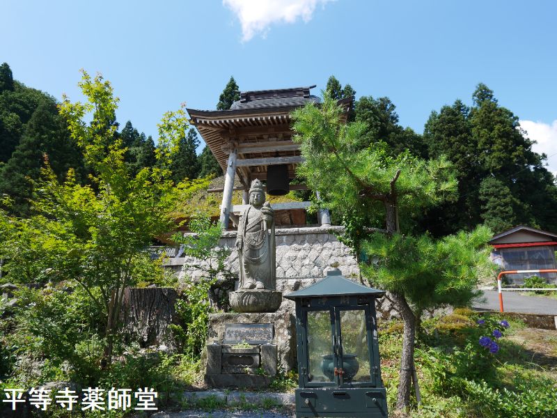 現在の平等寺薬師堂は室町時代後期の永正14年(1517)に永源和尚の発願により再建された建物で、木造平屋建て、寄棟、茅葺、妻入り、間口3間、奥行き4間、外壁は真壁造り素木板張り、意匠や組物など当時の禅宗様の特色が見られます。平等寺薬師堂は室町時代に建てられた御堂建築の遺構として大変貴重なことから大正12年(1923)に国指定重要文化財に指定されています(建築年が明確な建物としては新潟県2番目の古さ)。又、平等寺の境内の前には会津地方から越後地方を結ぶ街道沿いにあった為、戦国時代には軍道として利用され、内部には元亀、天正から元和年間に兵士が平等寺を宿所や参拝した際に様々な落書きを残しています。特に天正6年(1578)に上杉家の後継者争いによって勃発した「御館の乱」で、武力介入し敗れた芦名家の家臣のものあり歴史的にも価値があるそうです。山号:岩谷山。宗派:曹洞宗。本尊:薬師如来像(旧本尊は戦後盗難)。