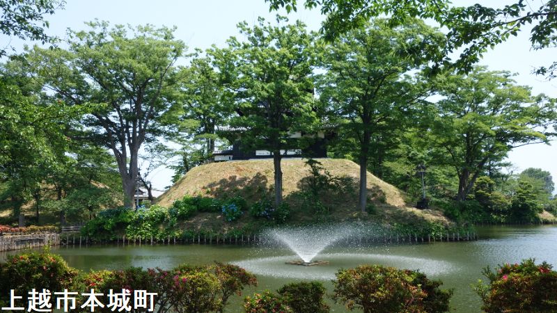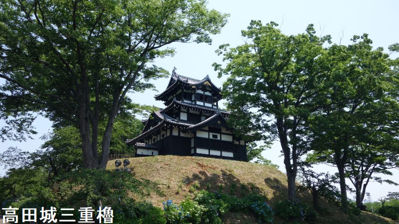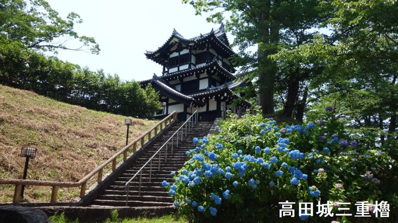 高田城は徳川家康の六男、松平忠輝の居城として天下普請によって築かれた城です。城の縄張りは忠輝の舅である伊達政宗が担当しました。江戸時代の築城であるにもかかわらず、石垣はなくすべての曲輪に土塁が採用されていますが、これは「大坂冬の陣」の直前で工事を急いだことなどが原因だと考えられています。現在は高田公園として整備されており、堀や土塁の一部を見ることができるほか、天守の代用とされていた三重櫓や、二の丸から本丸に渡っていた極楽橋が再建されています。また春には日本三大夜桜にも選ばれているソメイヨシノを、夏には東洋一といわれる蓮を楽しむことができます。