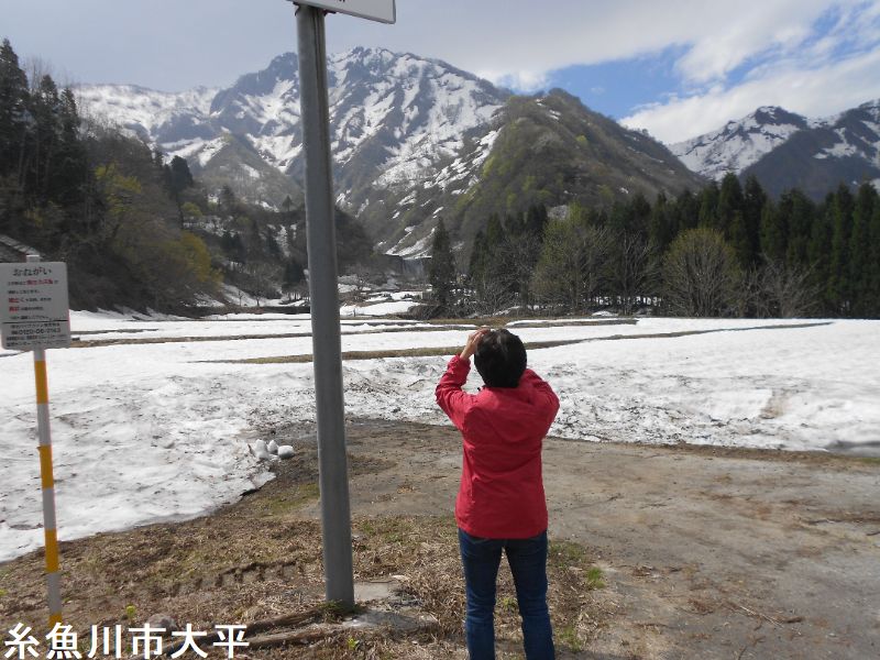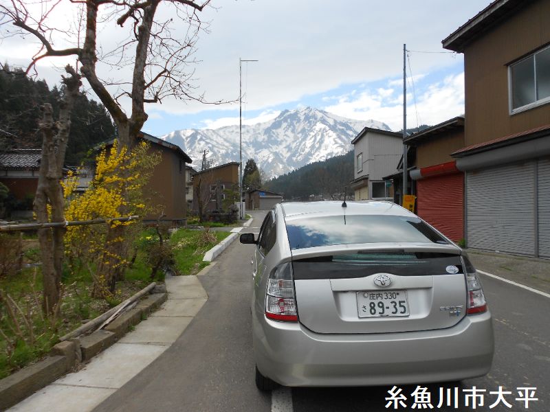 糸魚川市大平は、JR北陸線の梶屋敷近くから県道270号線で早川に沿って奥に入ると入口に比べ雰囲気が明るくなり、平地も意外と広く奥にはスキー場やら笹倉温泉があります。積雪時用の道路脇のポールは車高より高く雪深さが想像できますし、目の前の山にはまだ残雪が美しく残っています。