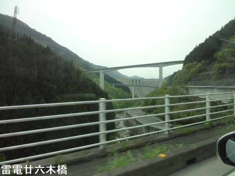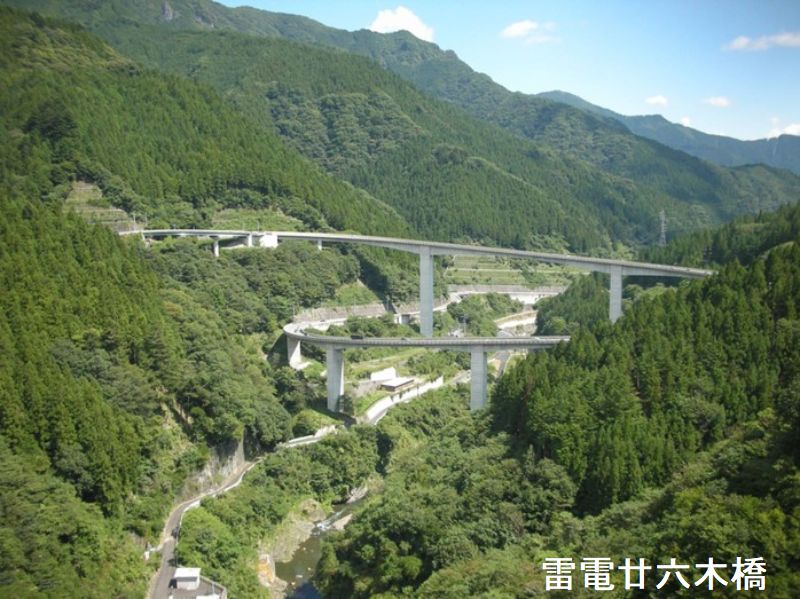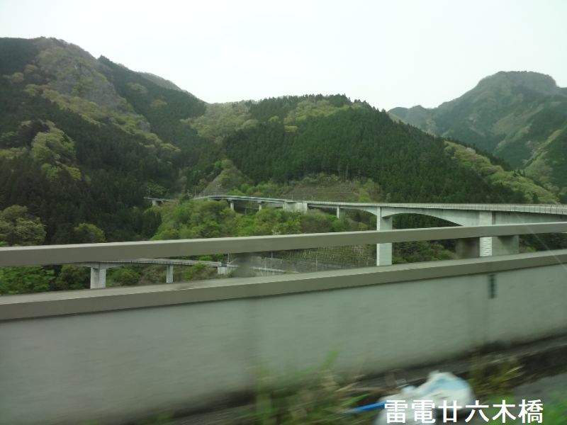 雷電廿六木橋は、廿六木大橋(最大スパン75m、橋長270m)、大滝大橋(最大スパン125m、橋長345m)の二つの橋梁と、その間の145mの土工区間を合わせてループ形状を形成している一体の構造です。約125mの高低差をループで登るため、道路の勾配は55%から7%であり、秩父の方から登っていくと、道路の曲がり具合が良くわかり、気持ちが高揚しながら高低差を登っていく様で、実に快適です。ループの形状も一定の曲率の円形ではなく、それ故、単調に感じません。この橋梁の最大の特徴は、コンクリートのエイジングをテーマとした造形デザインです。ひとつには、高さが30m~50mに及ぶ、幅6.5mの橋脚4基にほどこされたエッジをきかせた下見板風の表面の造形です。