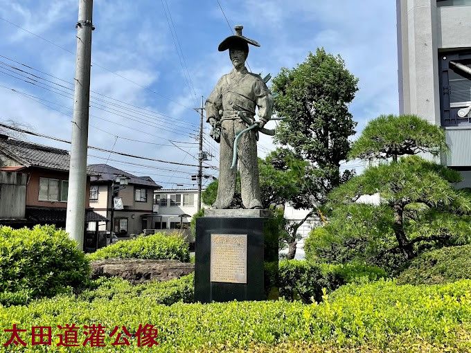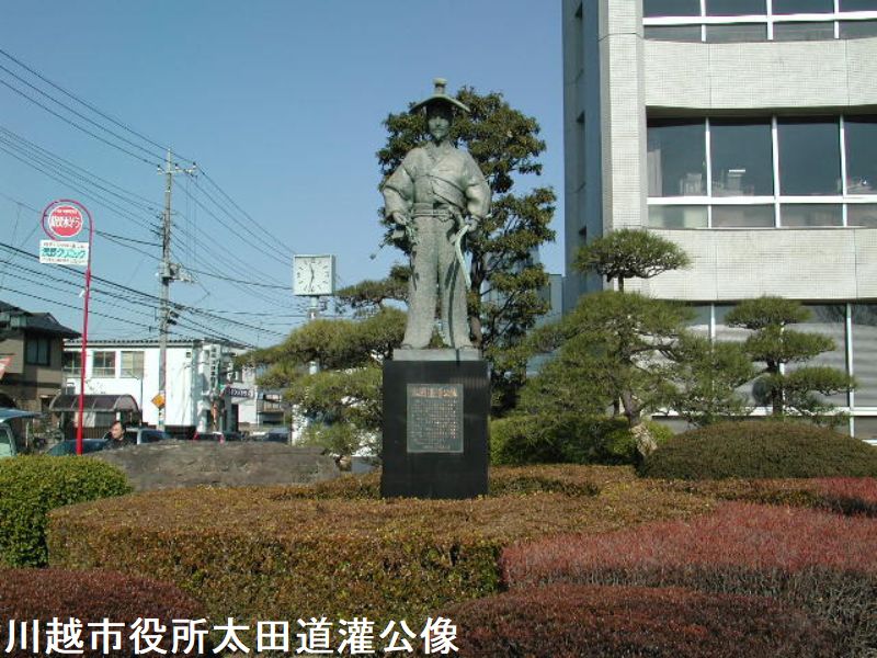 川越市役所前には、太田道灌の像が建てられています。観光客の方は割りと素通りされる傾向があるので、是非注目してあげてください。ちなみに太田道灌像は、「蔵造りの町並み」と「川越城本丸御殿」を結ぶ観光コースの途中にあります。太田道灌は、川越城、江戸城を築城した室町時代の武将です。ちなみに、この像が建てられている場所は、元々川越城の大手門があった場所。像のすぐ脇にはそのことを示す碑も建てられています。