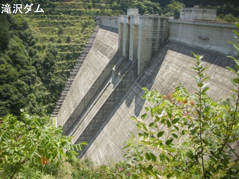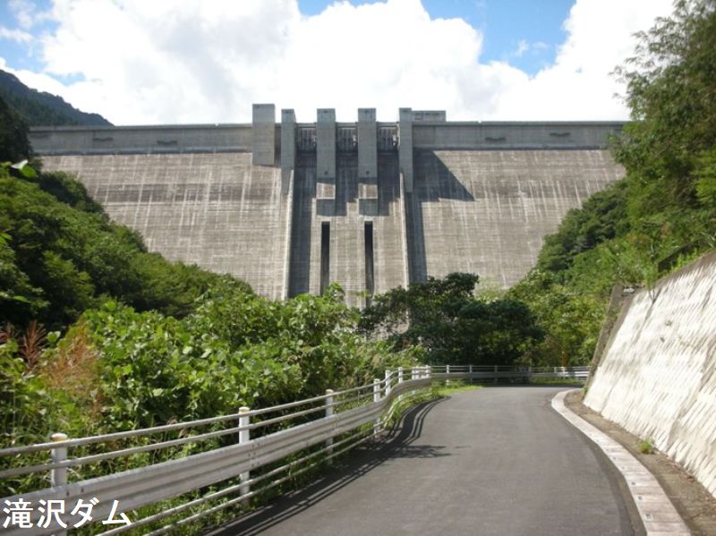 滝沢ダムは、秩父市の大滝地域(旧・大滝村)にあります。荒川の支流・中津川をせき止めて作ったダムで、ダム湖の名前は「奥秩父もみじ湖」です。ダムの堰堤は、高さが132m、長さが424mです。2005年(平成17年)に試験湛水が始まり、2008年(平成20年)に管理開始となりました。滝沢ダムには本体両側に階段があります。また、本体内部を通って見学できるエレベータもあります。これらによりダム下の「下流広場」とダム堰堤上を移動することが可能です(定期点検や天候、その他により利用できない場合があります)。