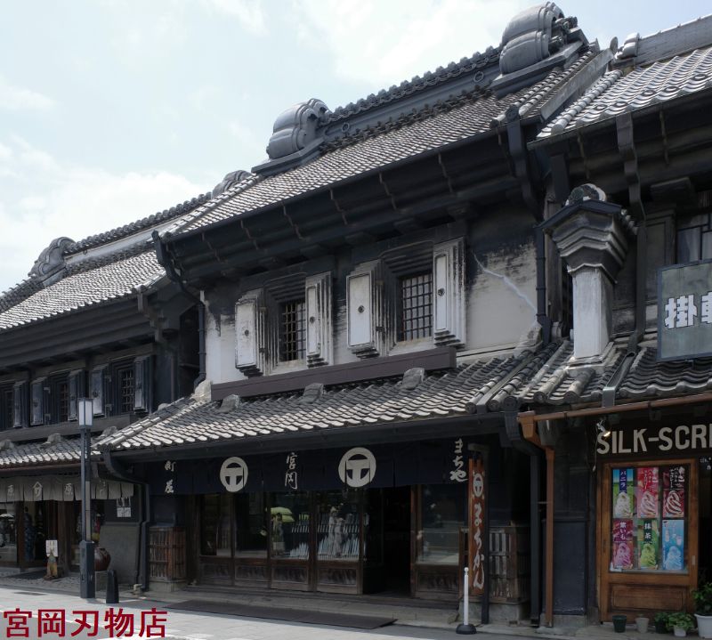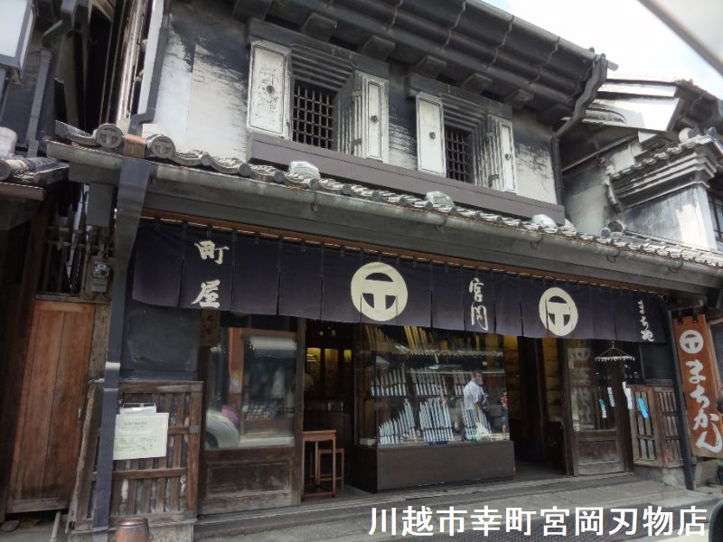 埼玉県川越市、川越市川越伝統的建造物群保存地区に選定される蔵造りの町並み(川越一番街商店街)にある蔵造りの商家が、宮岡刃物店。一生使えるという包丁などを販売。天保13年(1843年)創業で、現存する建物は、明治26年の川越大火後の、明治30年築。宮岡家住宅として、川越市の文化財に指定されています。防火対策の観音開き扉、そして雨水を落としやすくするための傾斜の急な屋根が印象的です。屋根の箱棟の両端に付いているのは、鬼板(鬼瓦)を包む影盛。鬼瓦を大きく見せるため、左官職人が鬼瓦と棟の接合部分、鬼瓦の周囲に漆喰を盛り上げて二重構造にした鬼瓦です。宮岡刃物店の屋号は「町勘」で、暖簾に記される屋号紋は「マルに丁」です。ローマ字の「T」に間違えられますが、漢字の丁で、ここで売られるオリジナルの刃物には「町勘」の屋号が刻印されています。