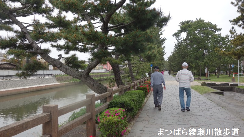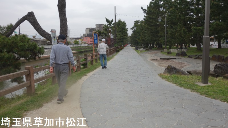 現在、車道は西側に移設、並木道には石畳の遊歩道が整備され、百代橋や矢立橋など県道をまたぐ歩道橋も架けられ、安全で快適なウオーキングコースとなっています。「日本の道百選」、「利根川百景」、「美しい日本の歩きたくなる道500」に選ばれるなど、多方面から注目される並木道になっています。草加松原遊歩道では、毎年、夏の風物詩「草加朝顔市」が開催されます。遊歩道の南側に位置し、綾瀬川舟運の船着き場を再現して整備された「札場河岸公園」内には、草加の地を訪れたとされる松尾芭蕉の像、松並木や綾瀬川を一望できる五角形の望楼など、宿場情緒あふれる建造物が立ち並びます。マンションなど高い建物と共存する松並木。草加駅を起点とする散策コースは、草加名物の煎餅のかおりを楽しみながら散策ができます。