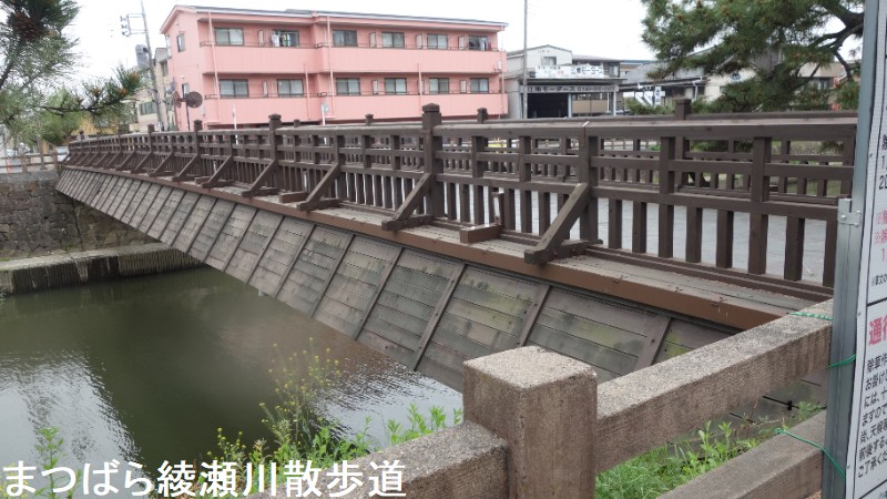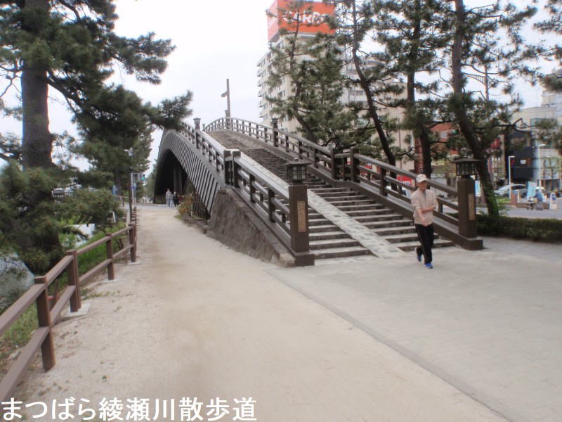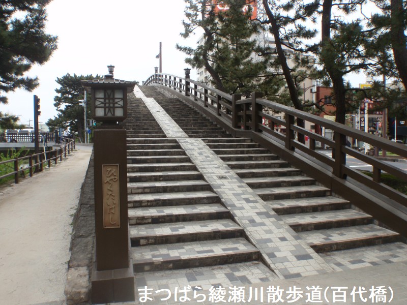 長さ62.5m、幅3.5m、高欄は木目調で,街道の雰囲気に合わせた常夜灯が設けられています。長さは「矢立橋(96.3m)」と比較すると「百代橋(63.5m)」は短いのですが [草加]市内を散策していると気付かれるとおもいますが [草加]市内のマンホールのデザインとして「百代橋」が使用されています。又「矢立橋」の橋途中に見られる装飾は[日光街道・草加宿]の陶板画となっていますが 絵柄的に多少稚拙感がありますので「百代橋」の《松ぼっくり》をモチーフとした装飾の方が好きだと言う方も結構いるかも知れません。遊歩道には松尾芭蕉の奥の細道からその名を引用したという太鼓型の2つの歩道橋「百代橋(ひゃくたいはし)」「矢立橋(やたてはし)」が架かっており、草加のシンボルとなっています。